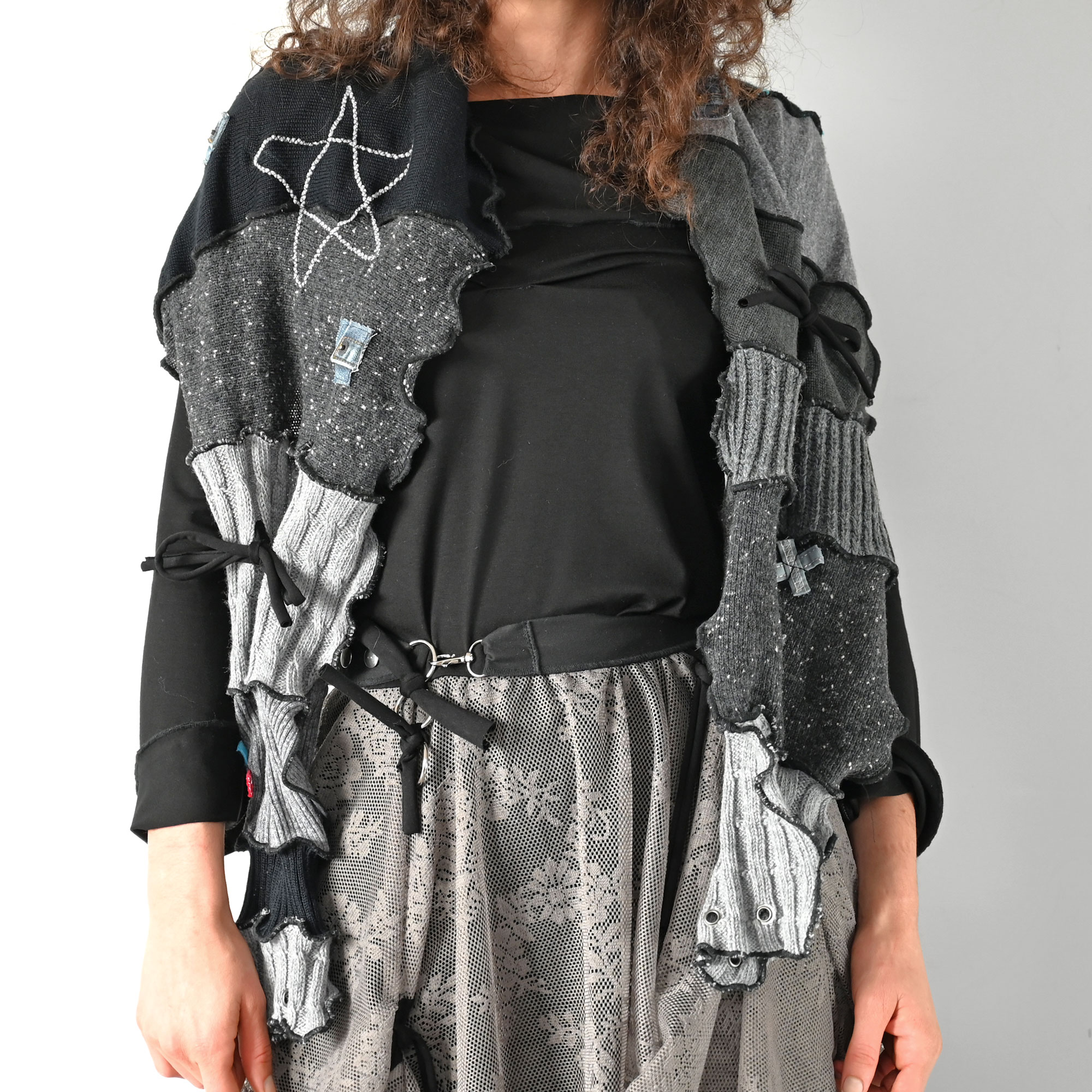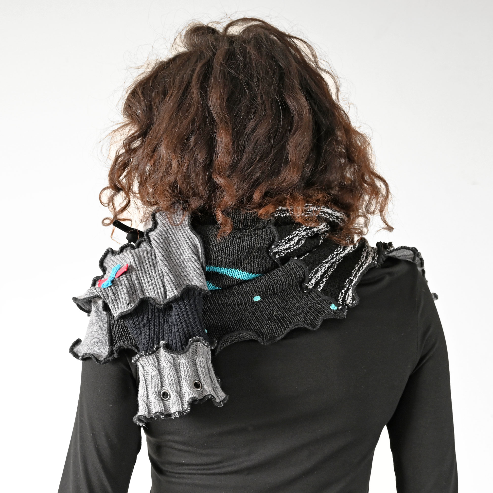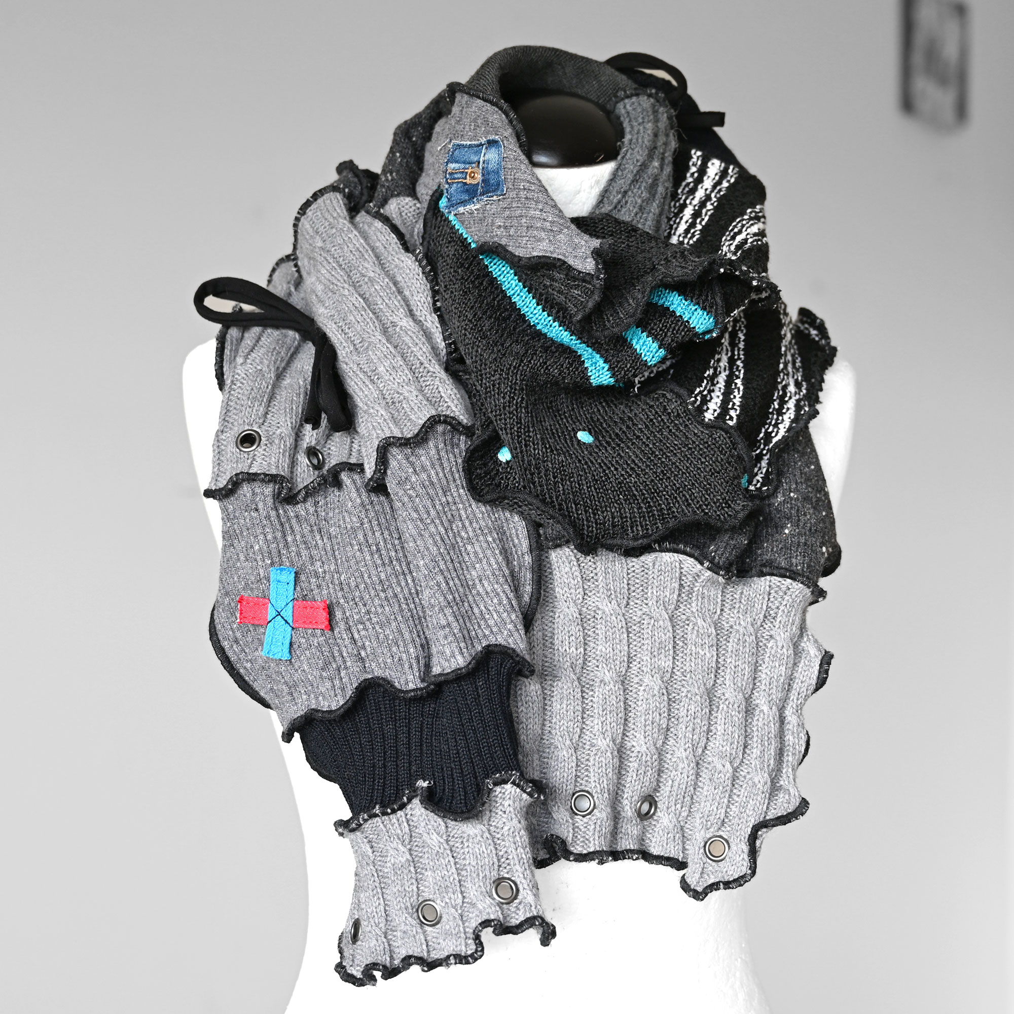 Upcycled scarf made of medium-thick knit, mostly wool and cotton. It is wider in the middle (about 42 cm) and narrower at the ends (about 22 cm). The total length of the scarf is about 170 cm.