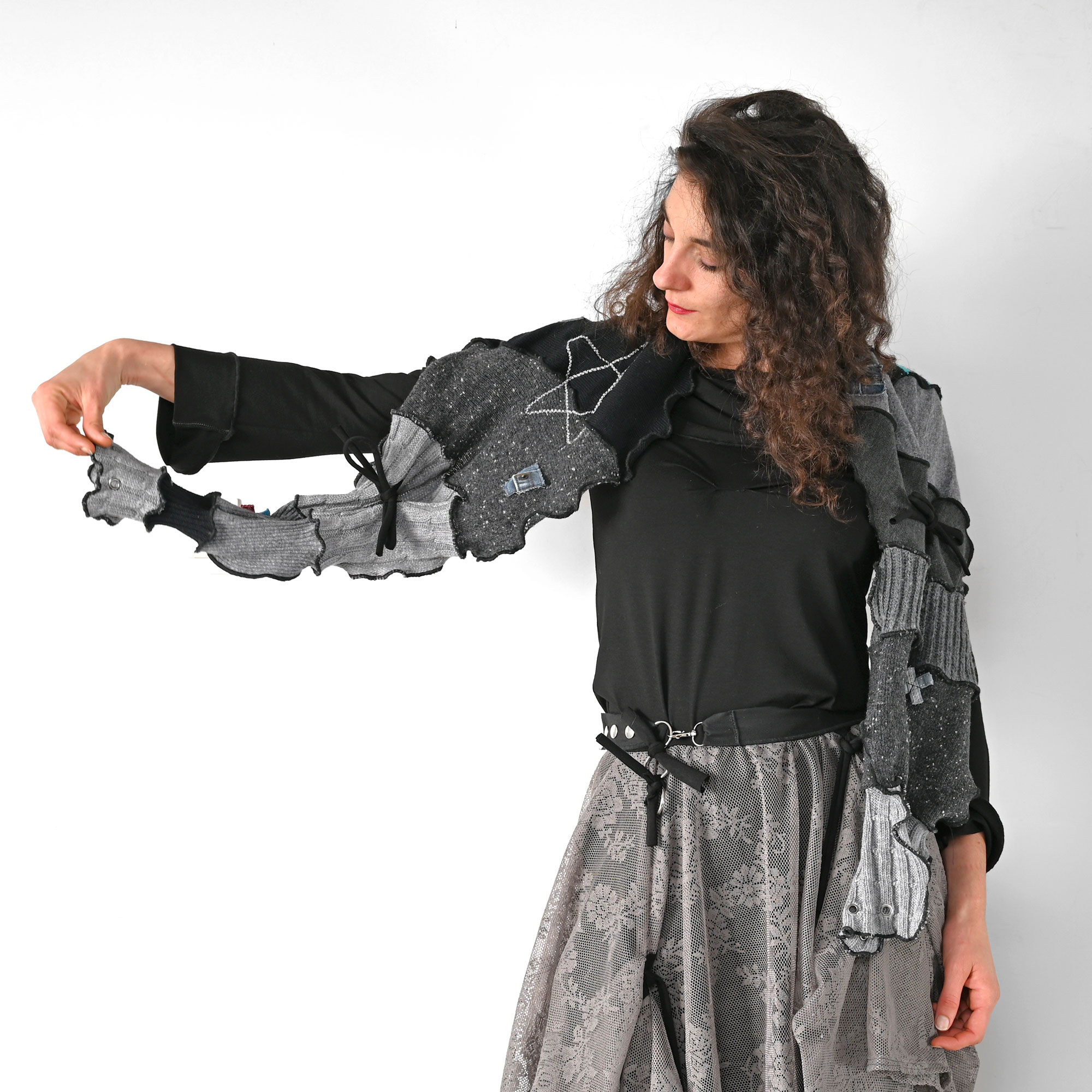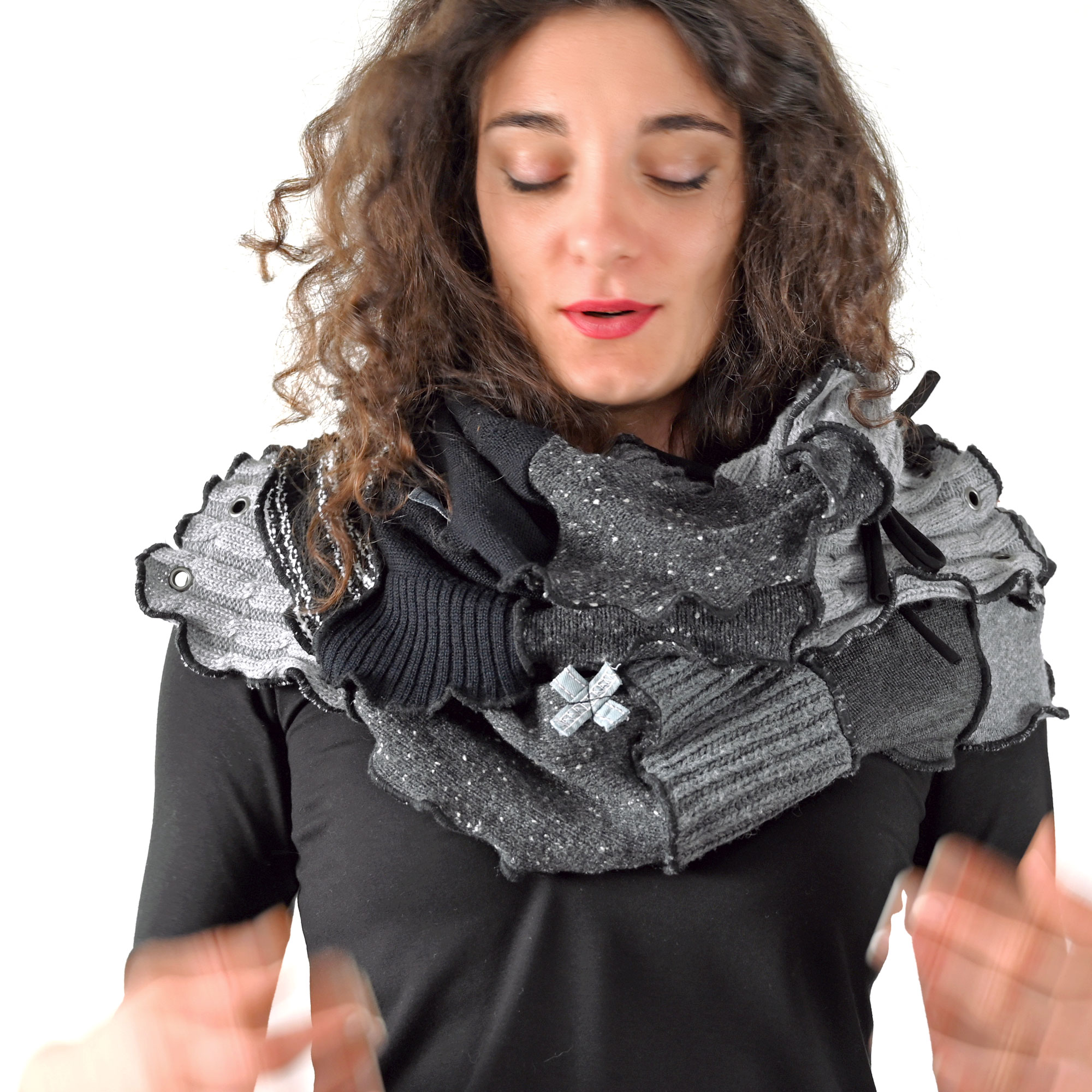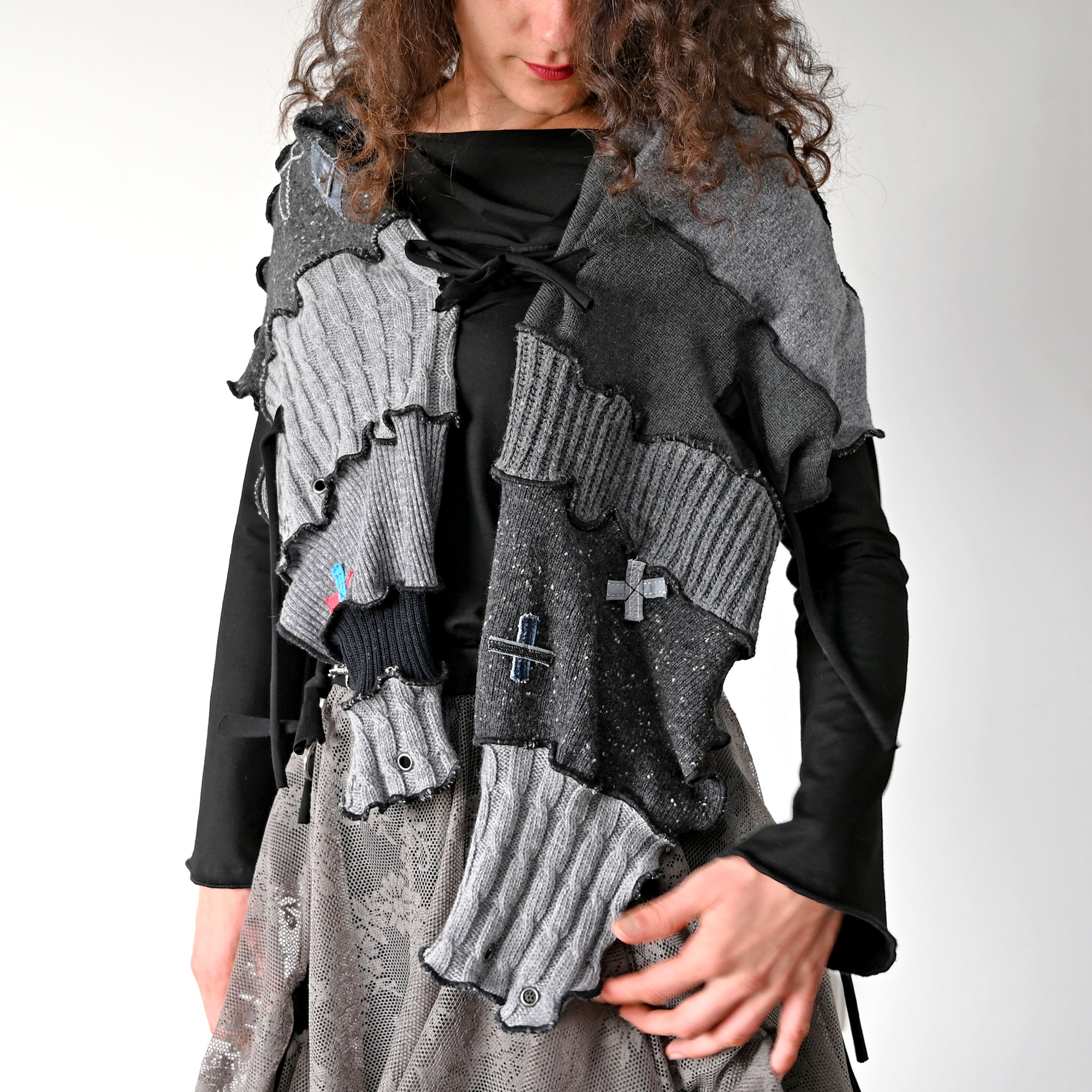 Upcycled scarf made of medium-thick knit, mostly wool and cotton. It is wider in the middle (about 42 cm) and narrower at the ends (about 22 cm). The total length of the scarf is about 170 cm.