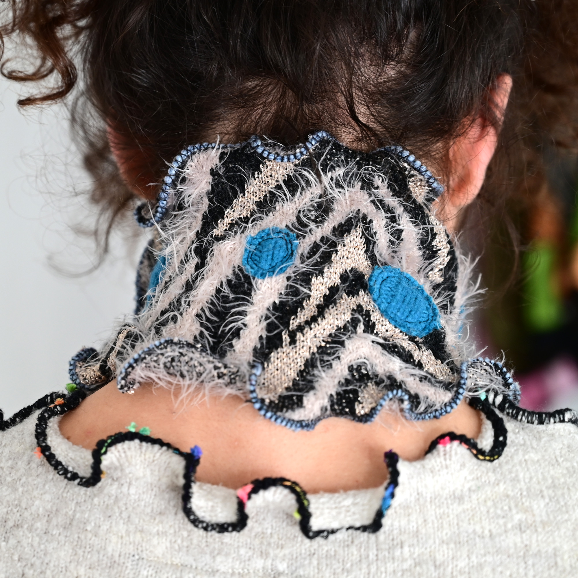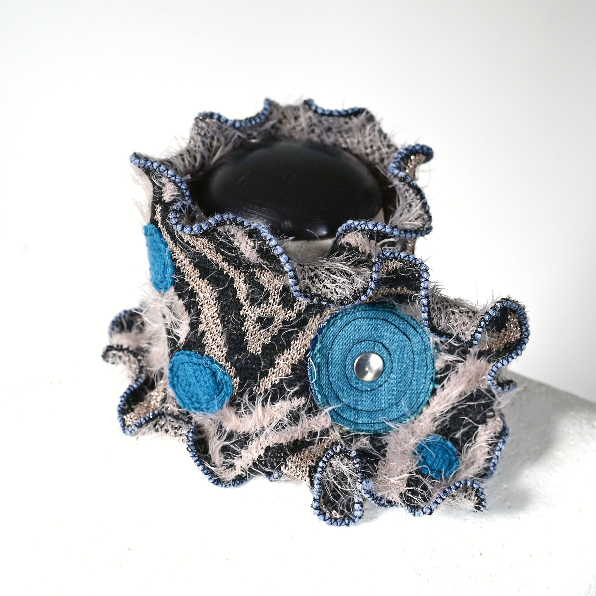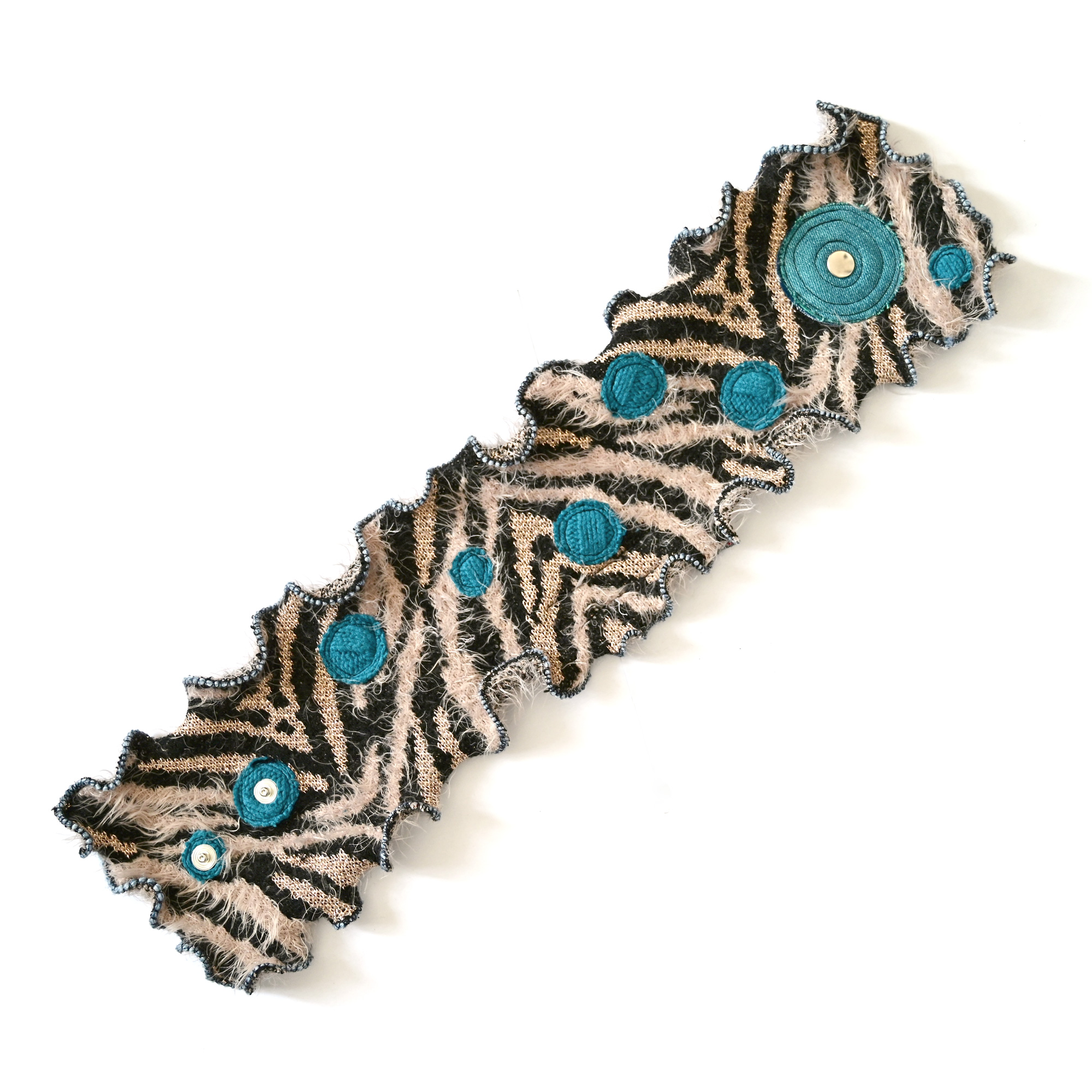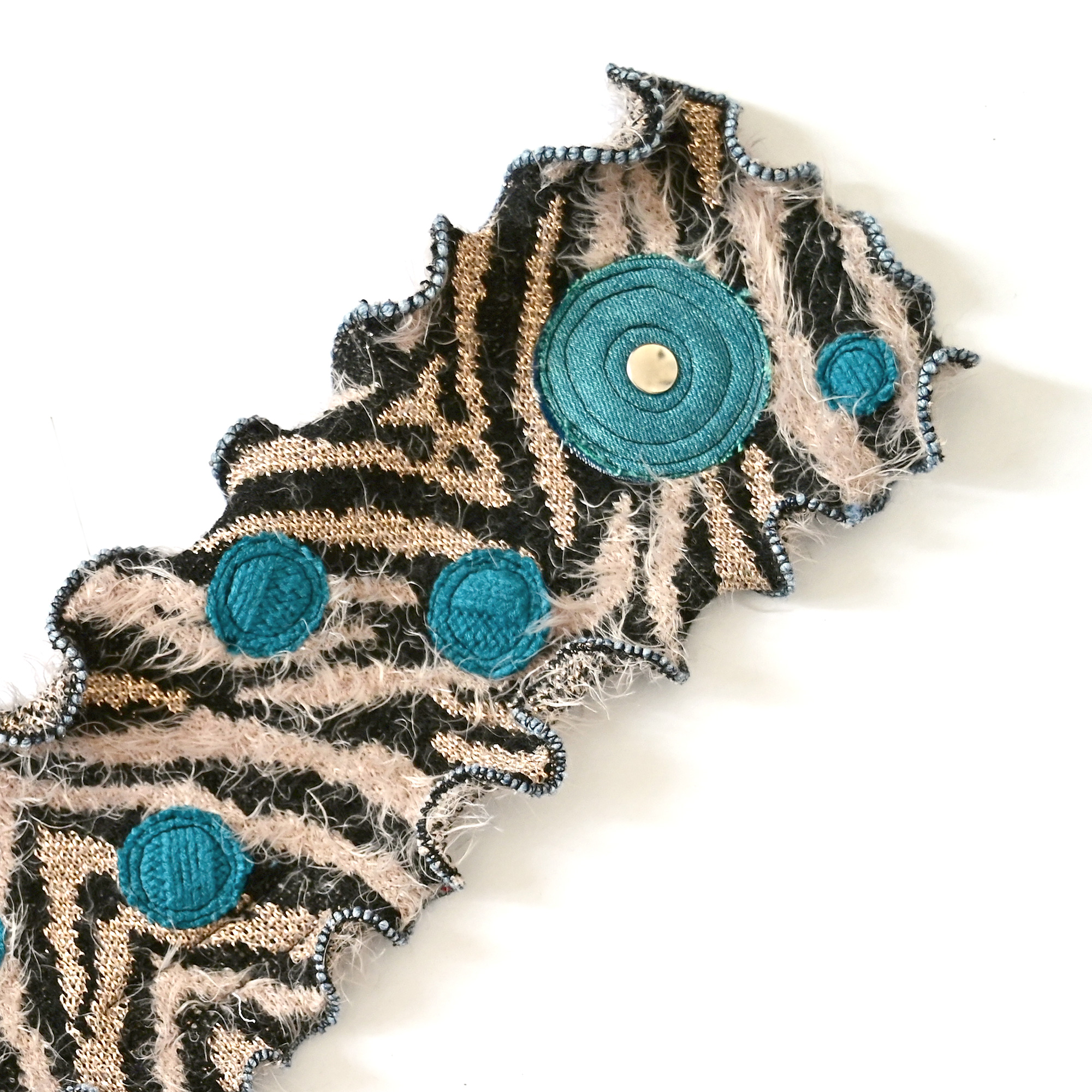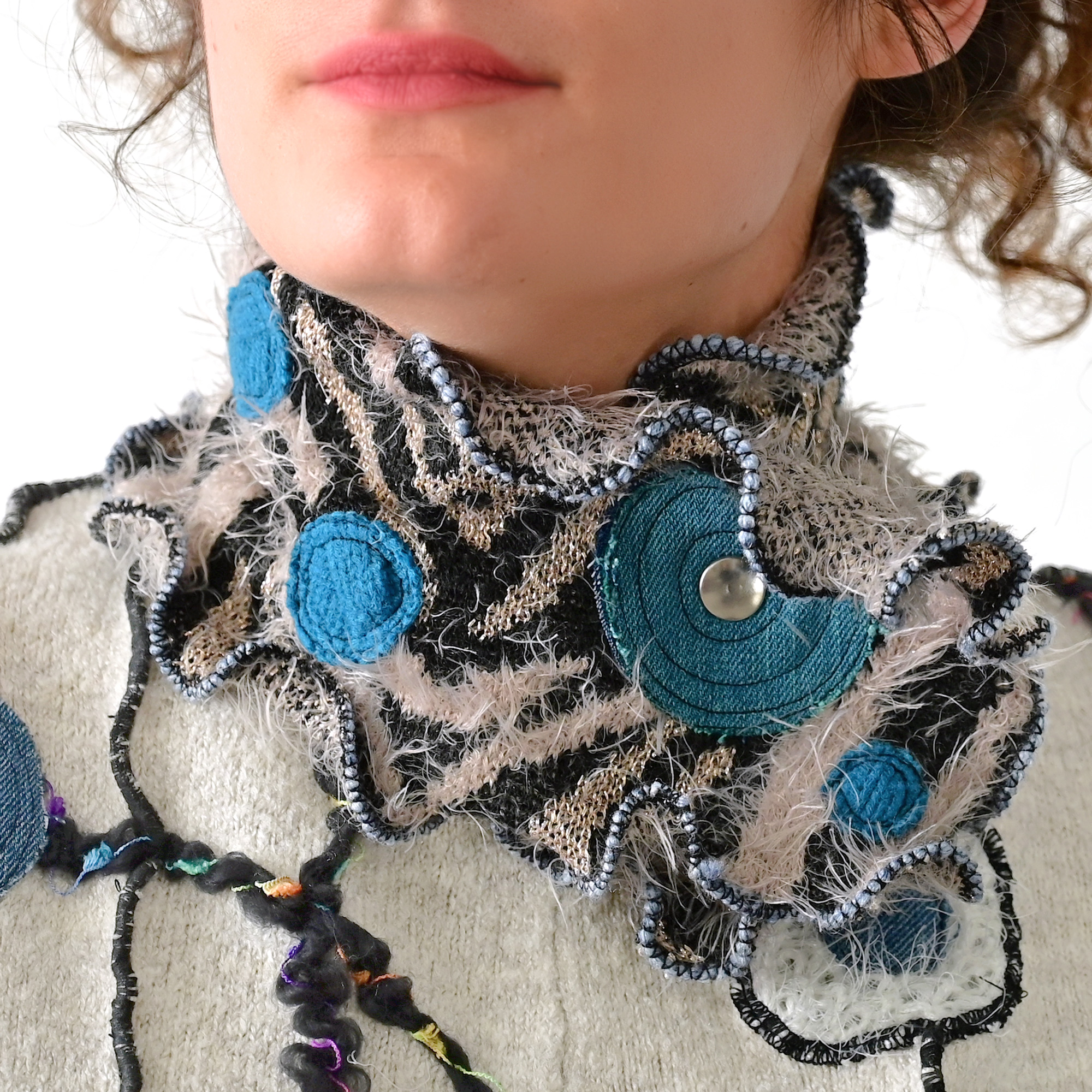 Scarv made of a thinner upcycled exciting shaggy knit, with turquoise blue circles. Fastens with a presser, two fastening positions are possible. Dimensions about 55 x 14 cm.