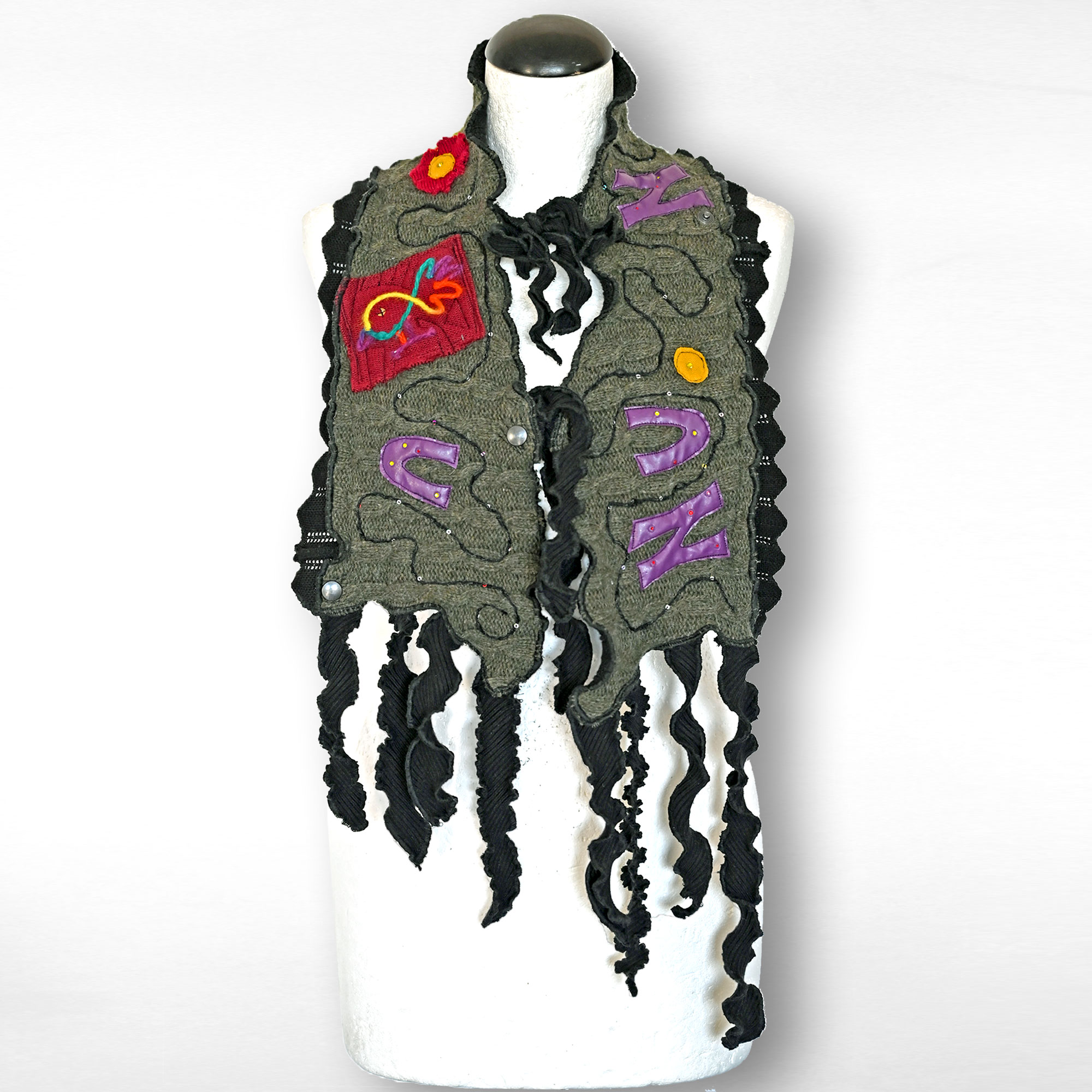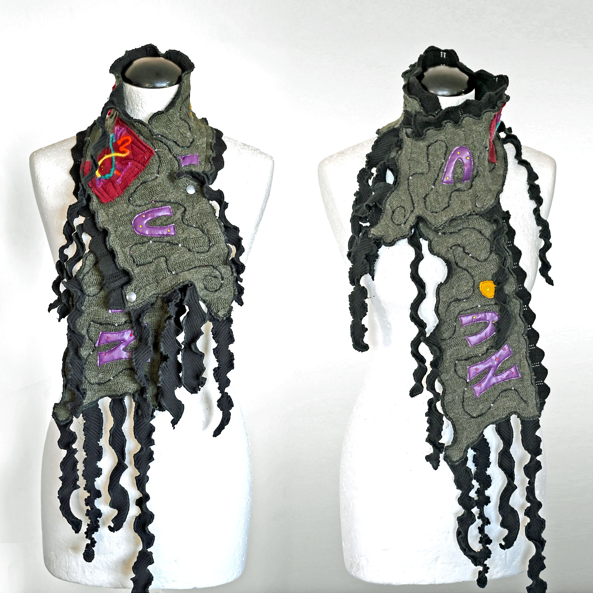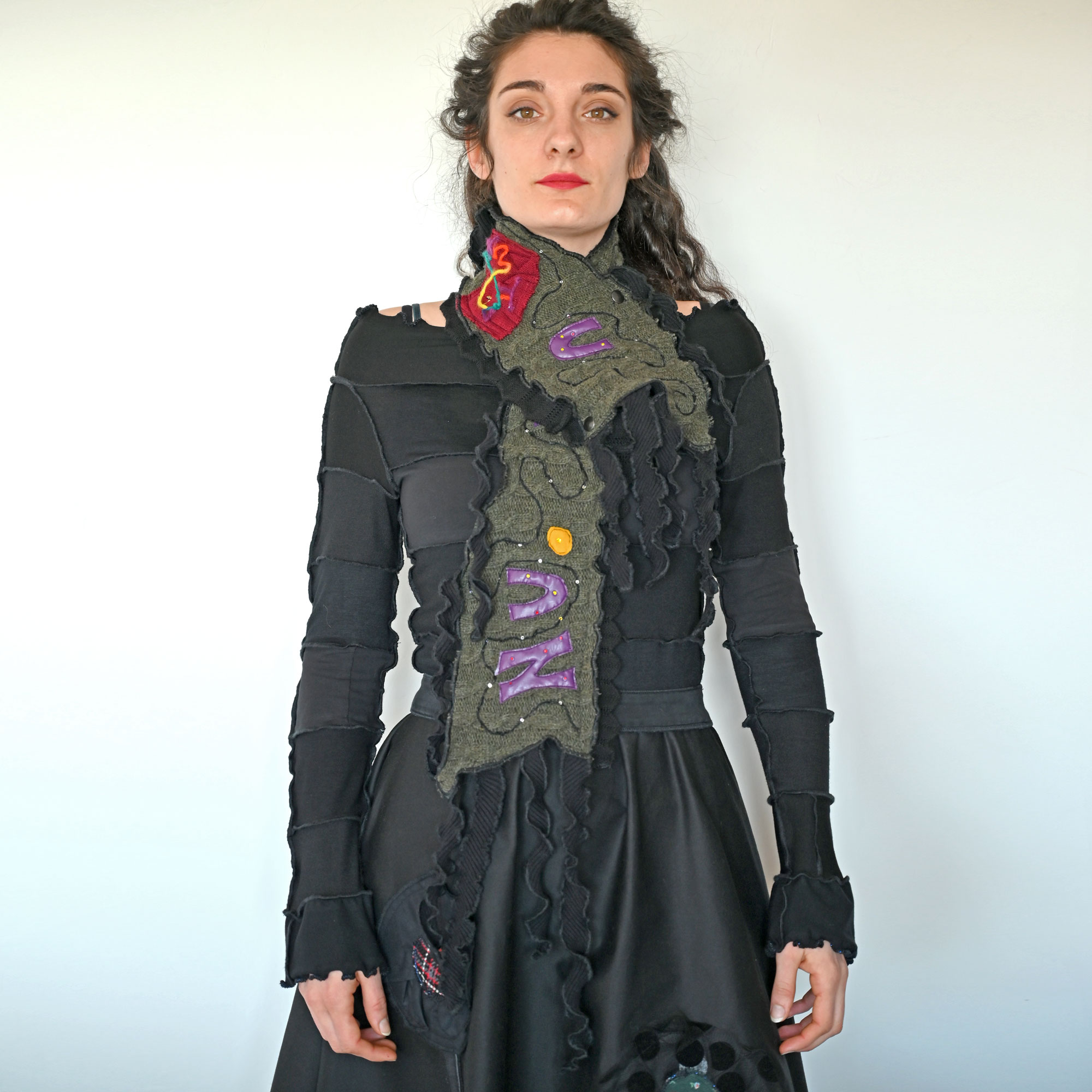 Partially upcycled wool scarf, lined with cotton knit. With several options for fastening with snaps or tying with playful spiral laces. Dimensions approx. 100 x 18 cm, not including laces.