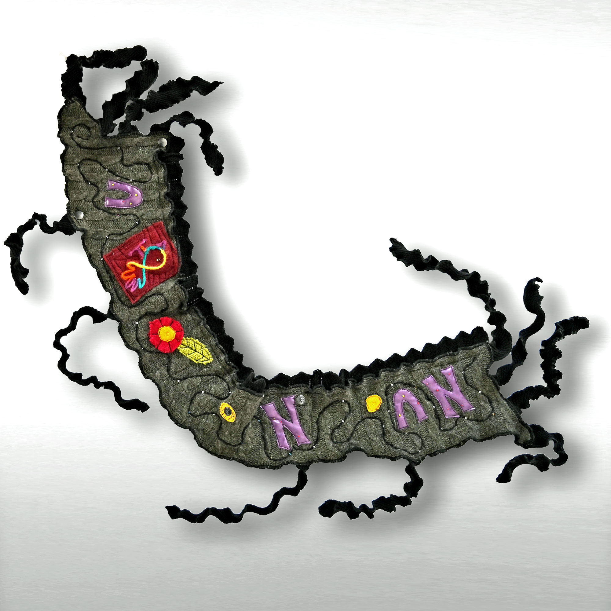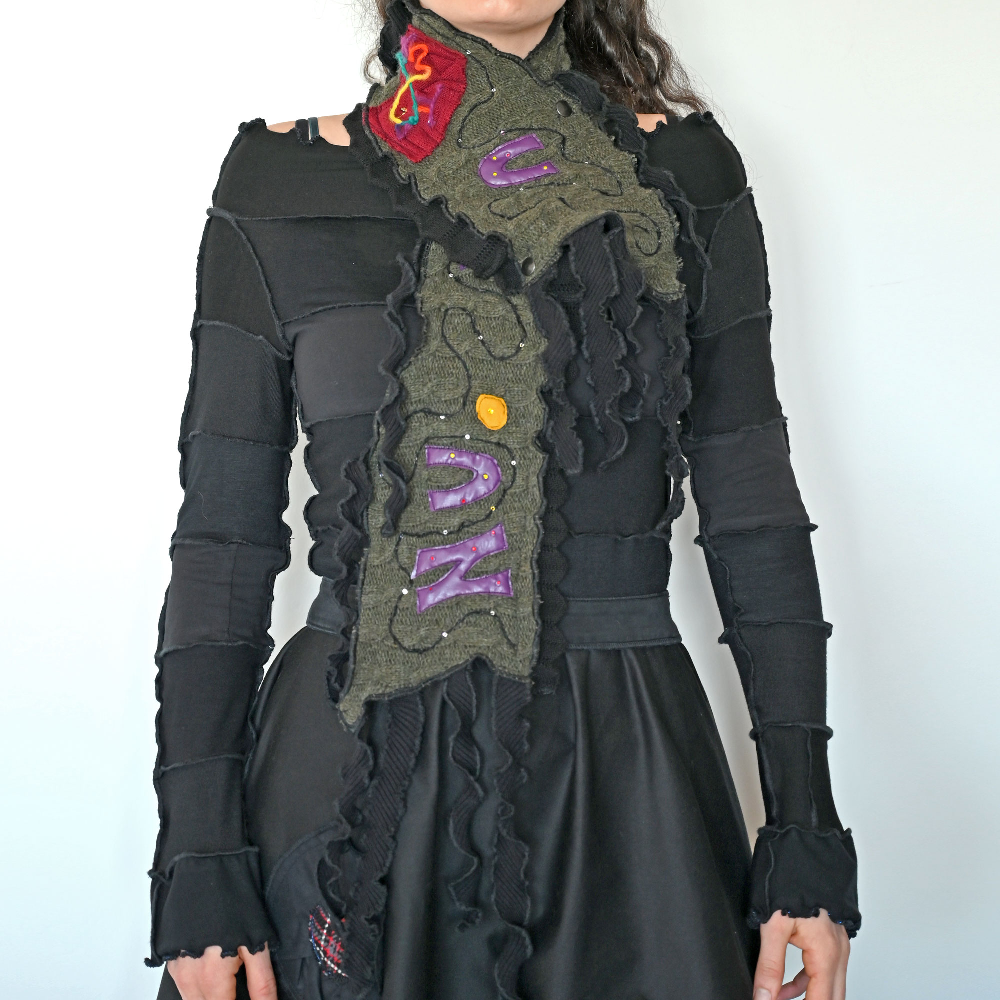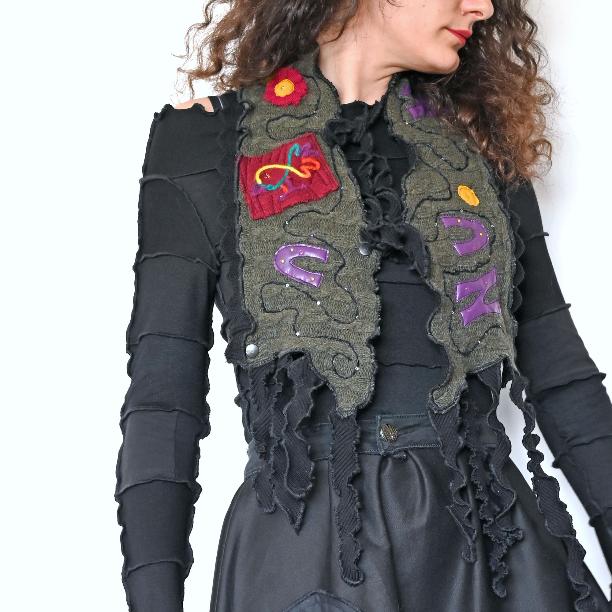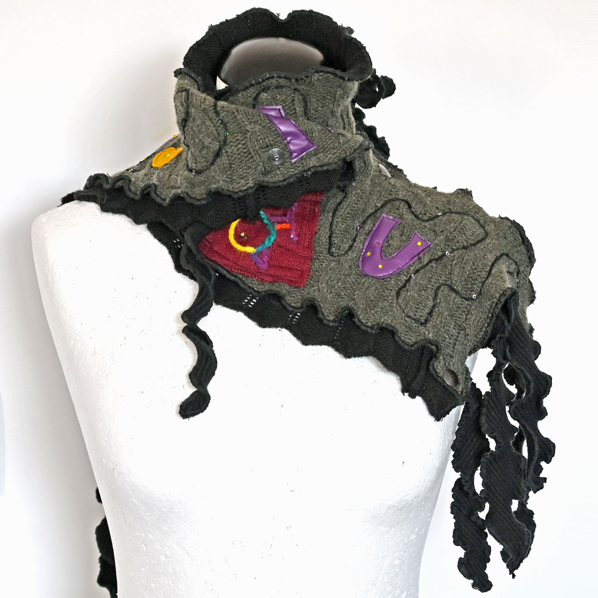 Partially upcycled wool scarf, lined with cotton knit. With several options for fastening with snaps or tying with playful spiral laces. Dimensions approx. 100 x 18 cm, not including laces.