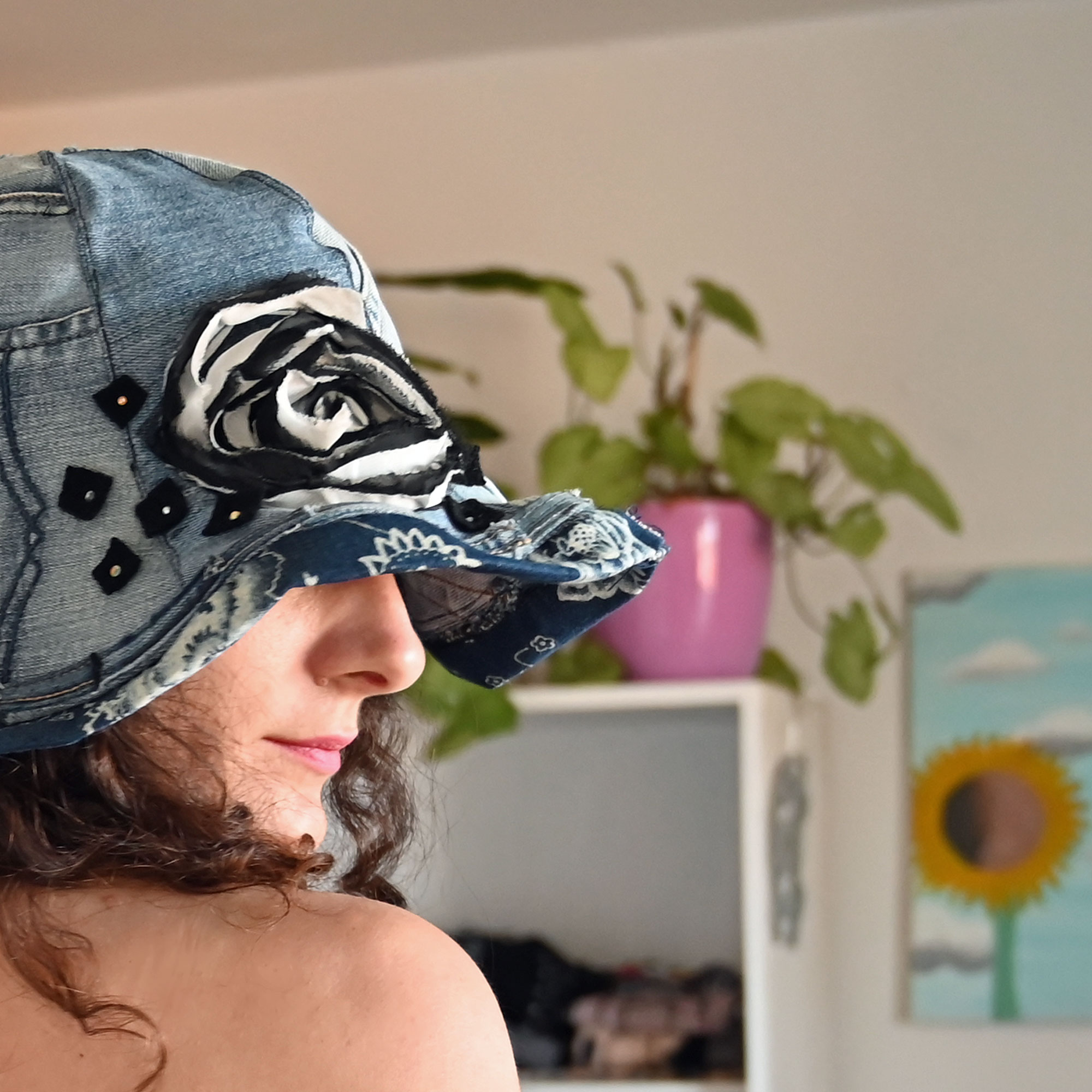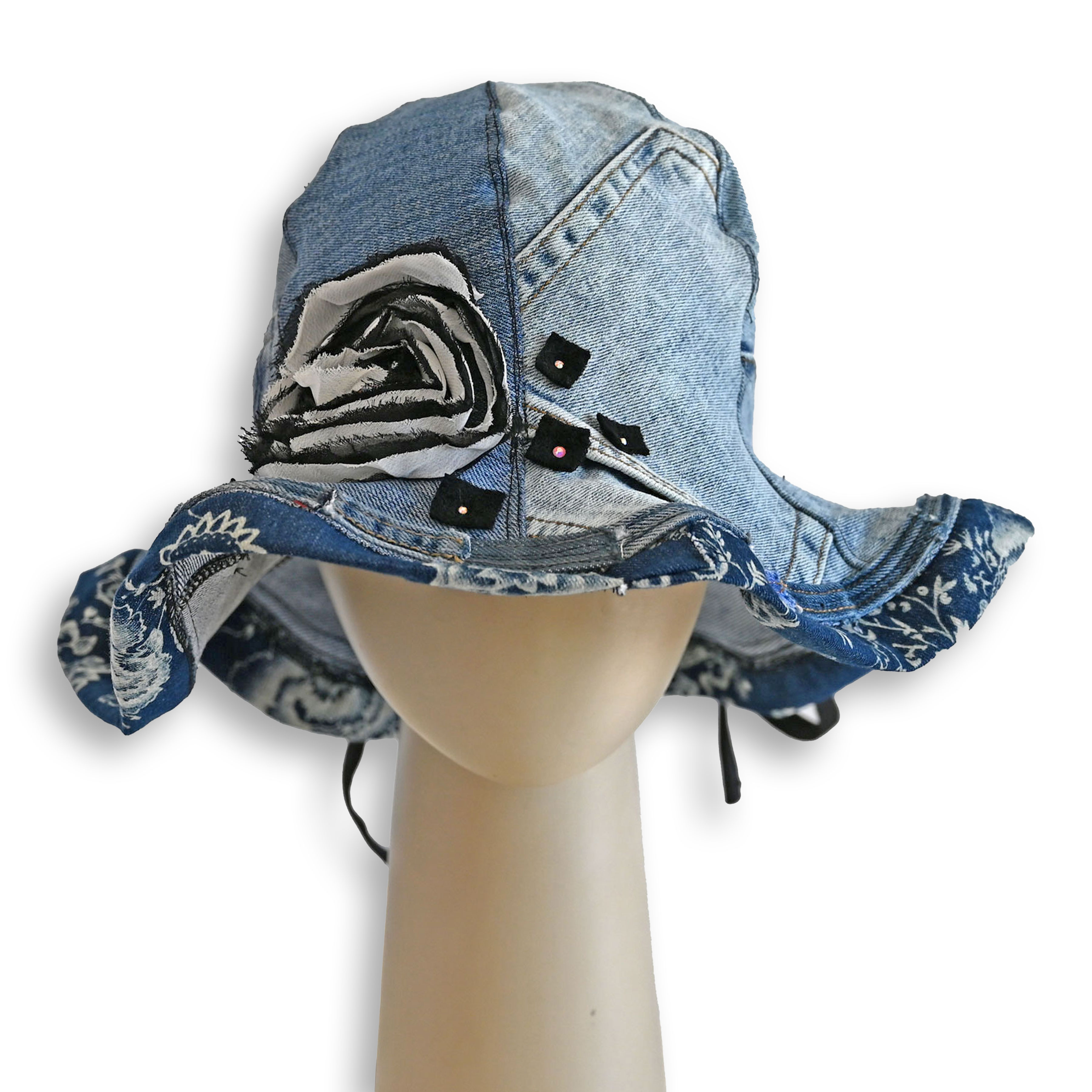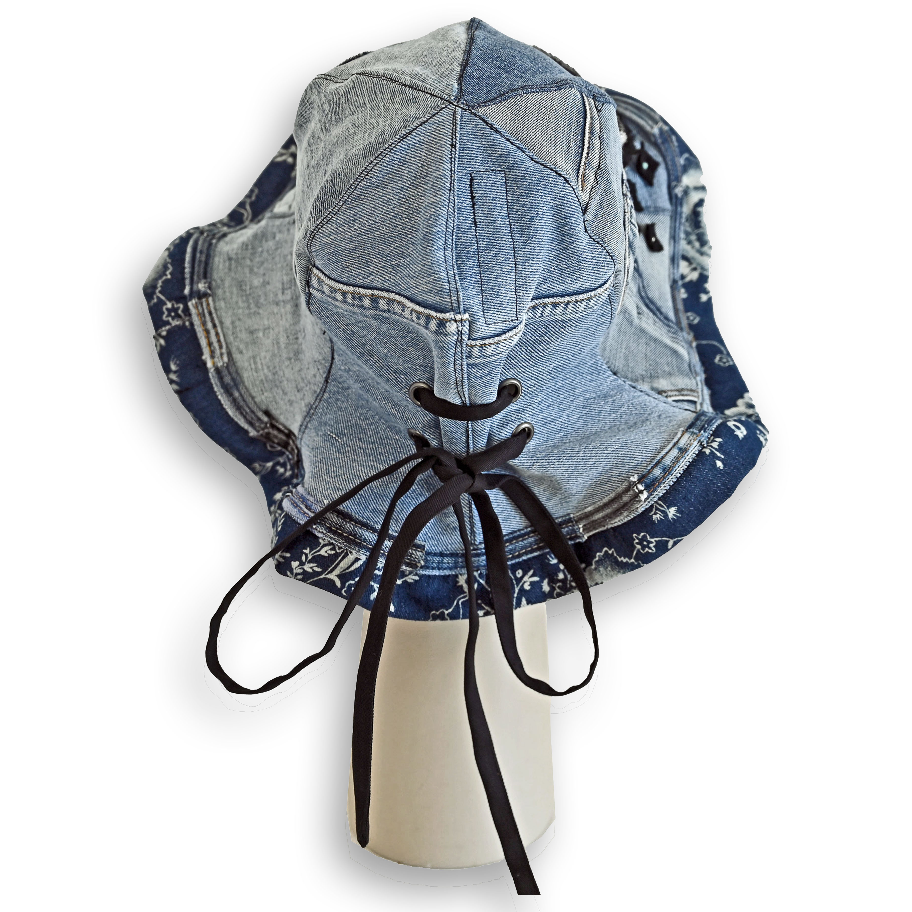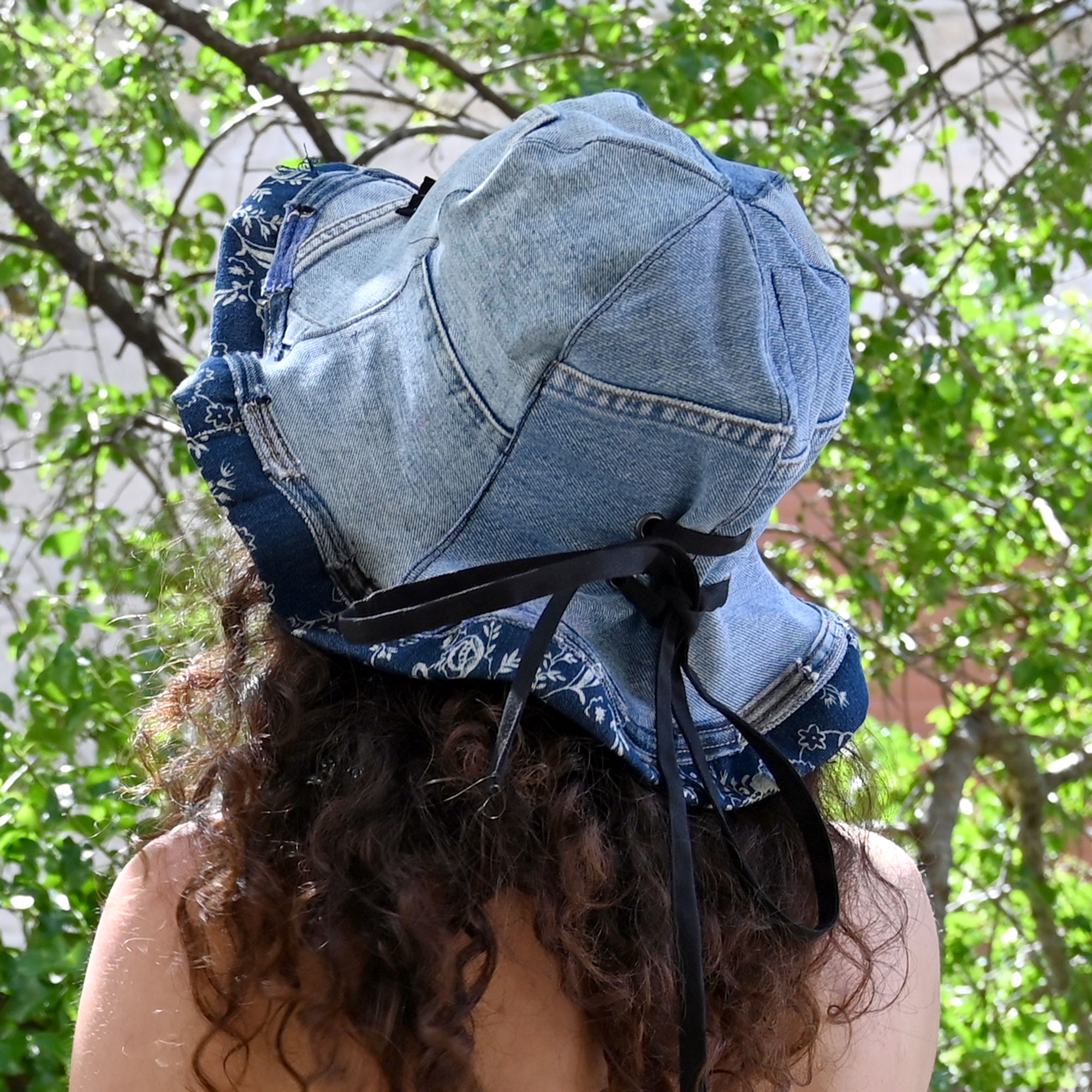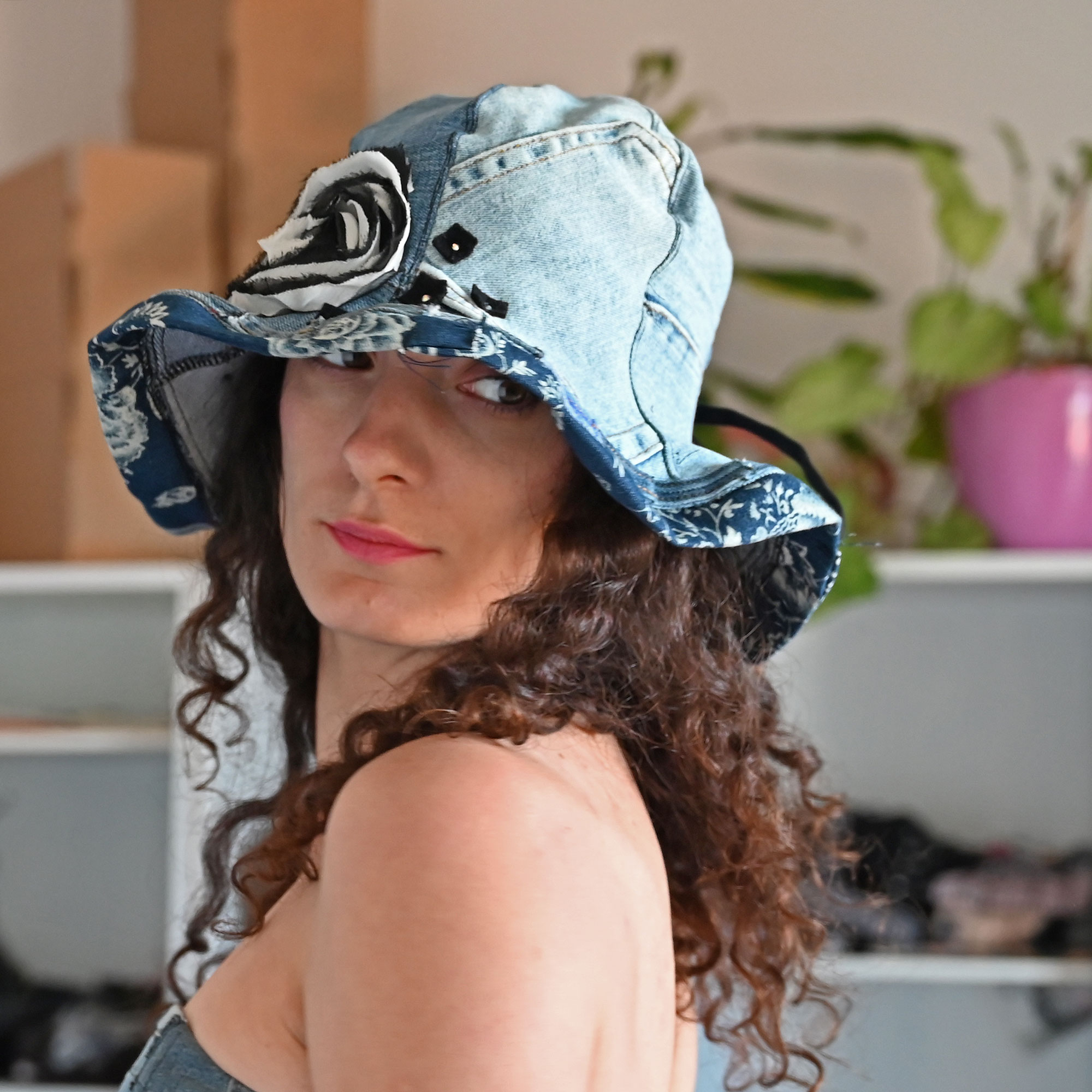 Lightweight recycled denim hat with a large brim. Composition: over 90% cotton. With a drawstring at the back to adjust the width of the hat. Series of four.