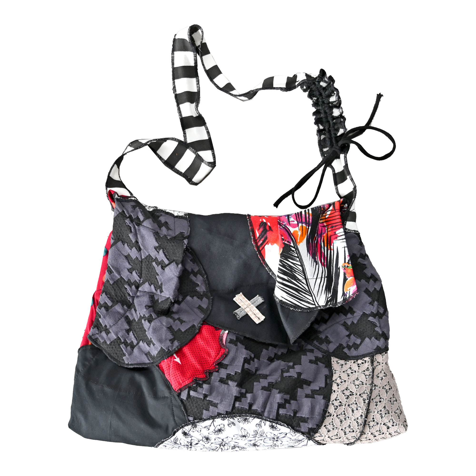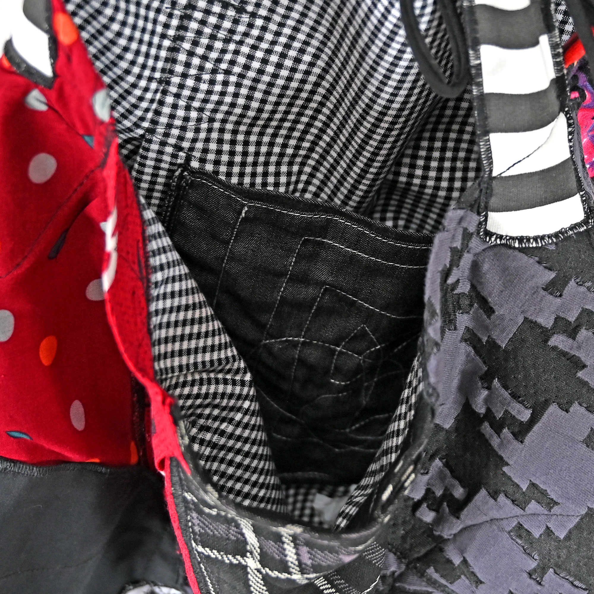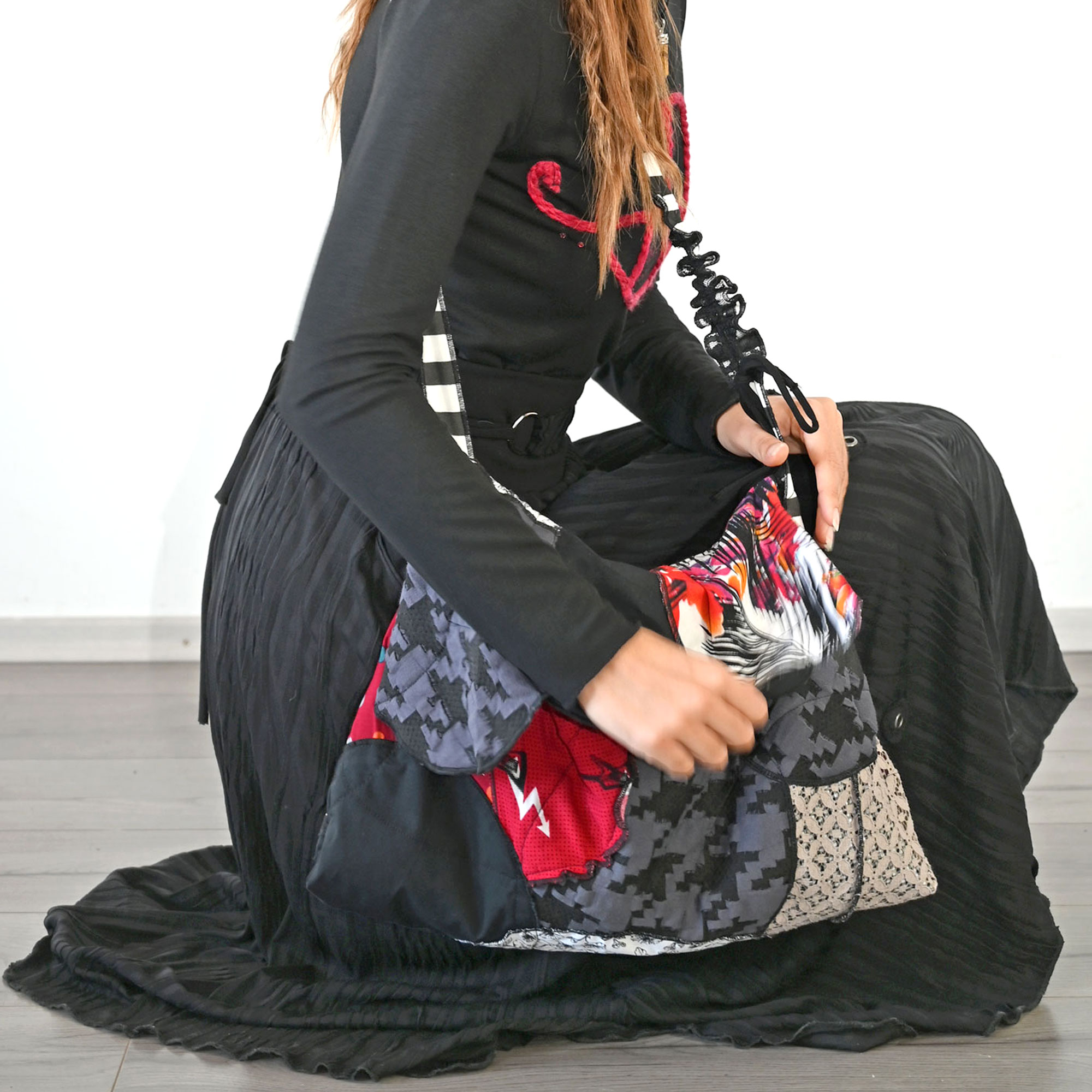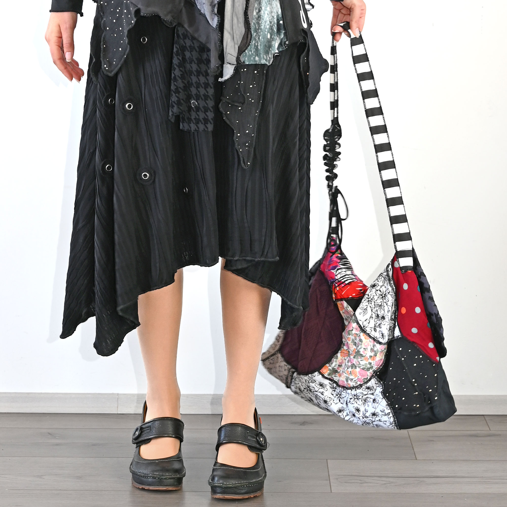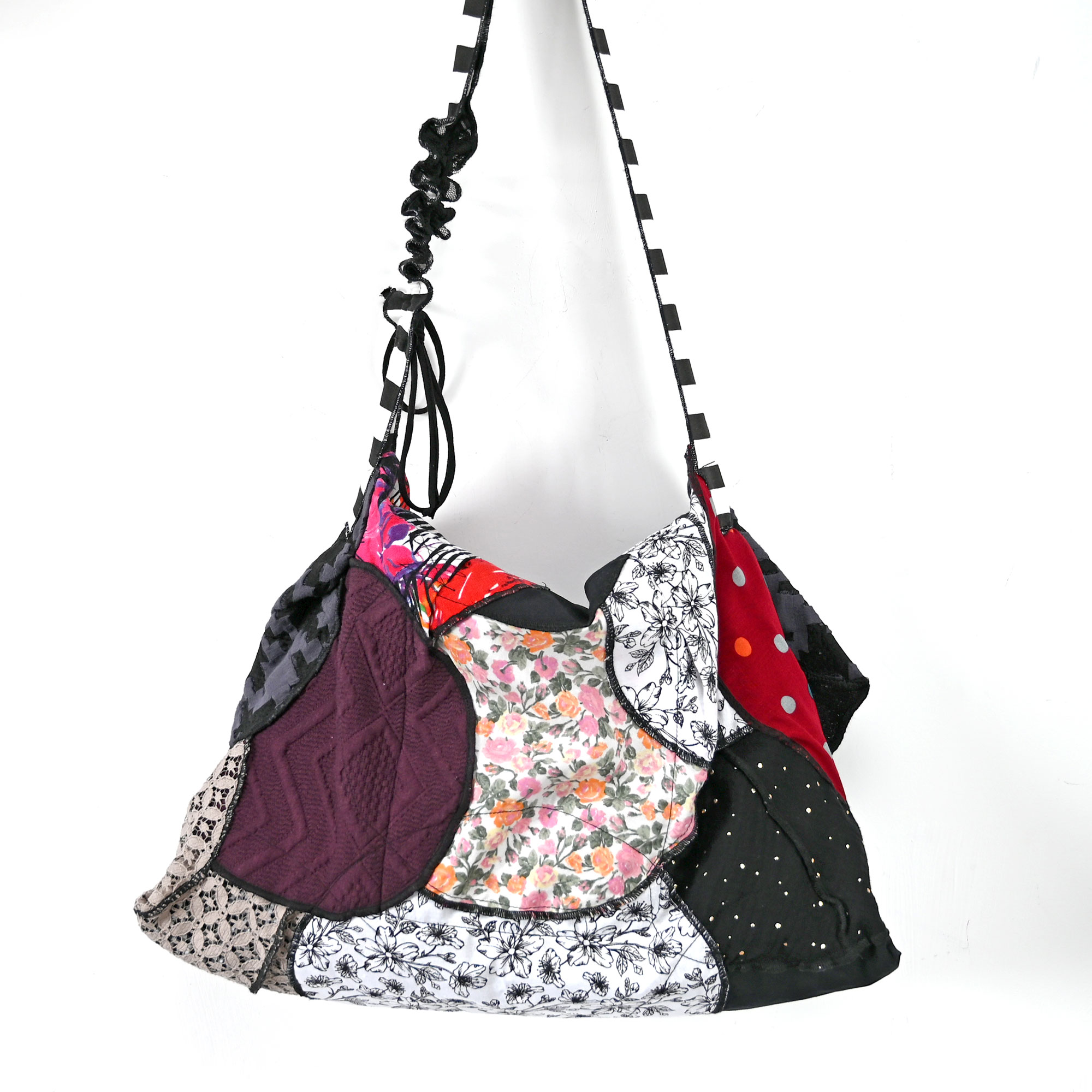 A bag made of different, mostly cotton circles-leftovers from production. Padded, but still soft. With double inner pocket. The length of the handle can be adjusted from 82 to 103 cm.