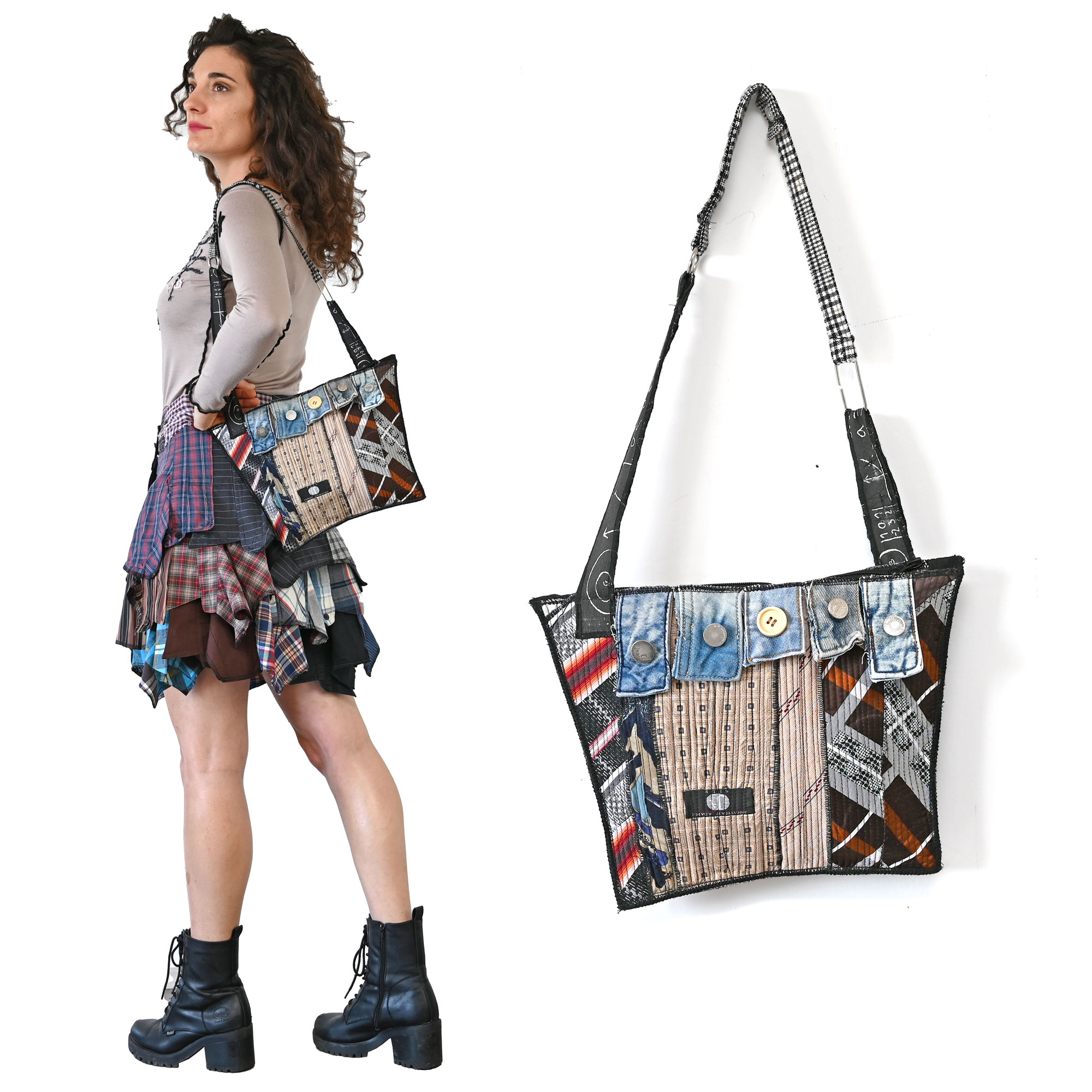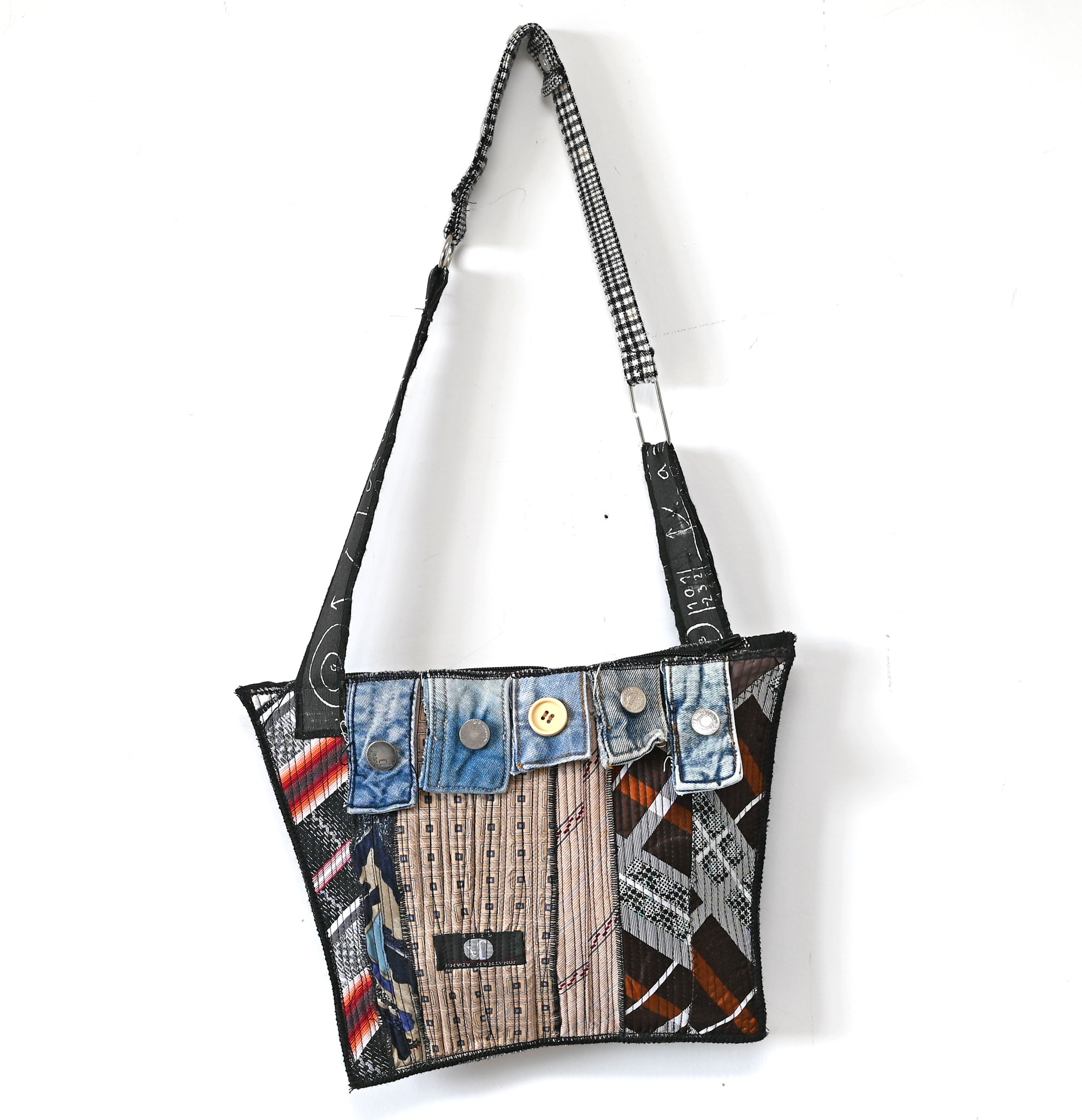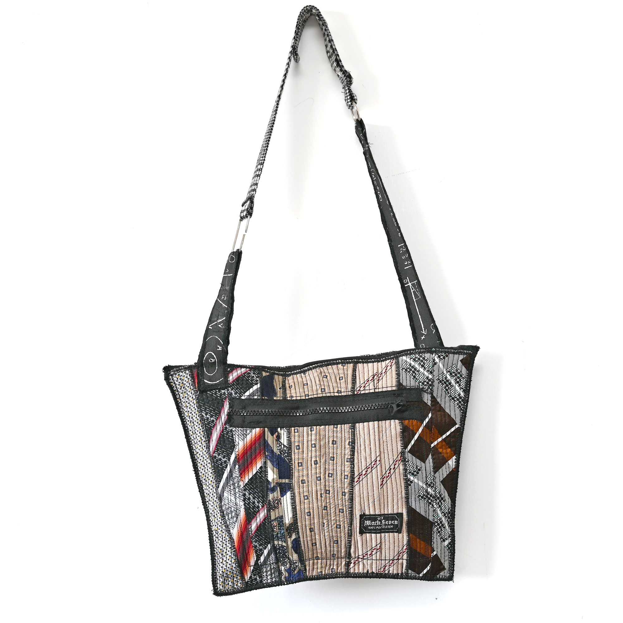 Bag made of upcycled ties with a sewn-in pocket with a zipper on the back. Handle length adjustable, from 72 to 91 cm. Height 26 cm. Width at the bottom 26, at the top 35 cm.