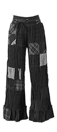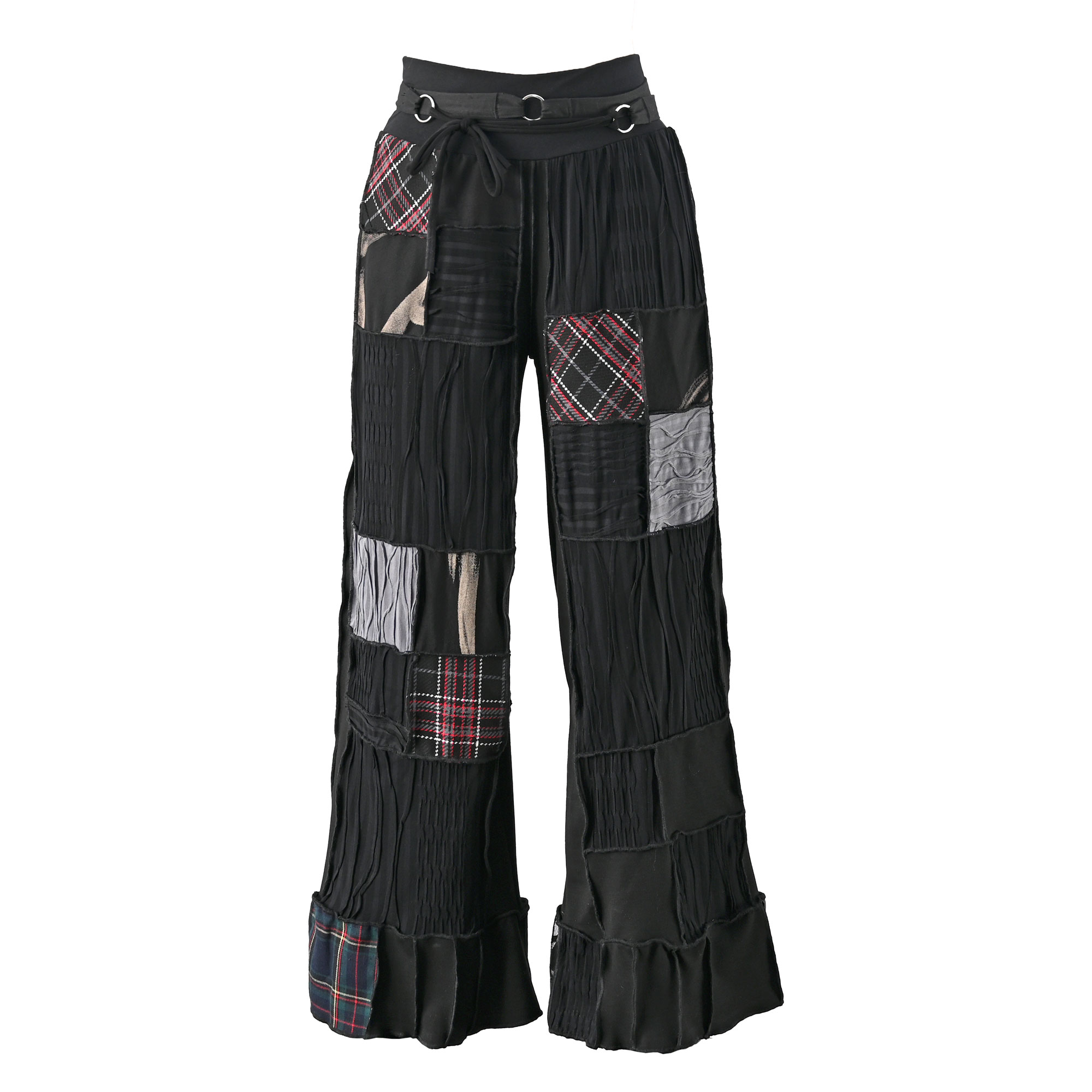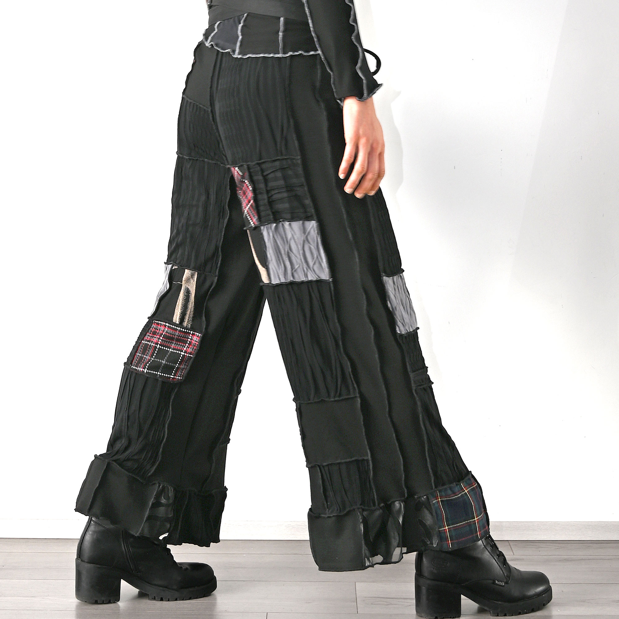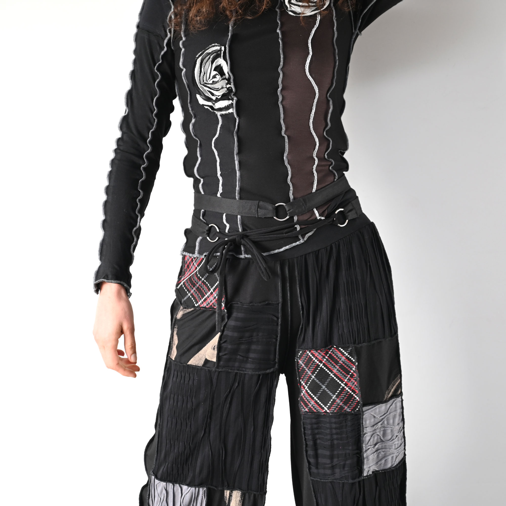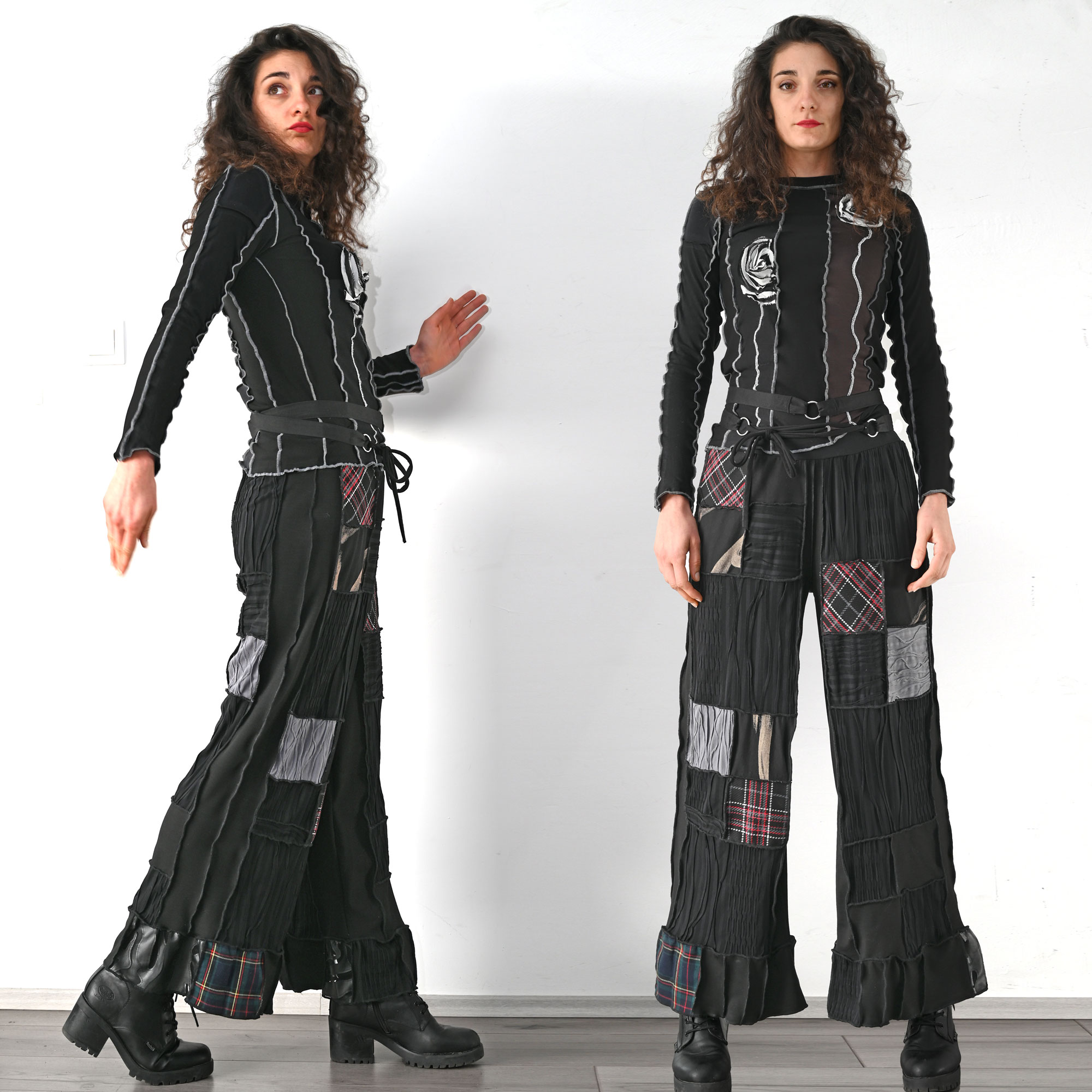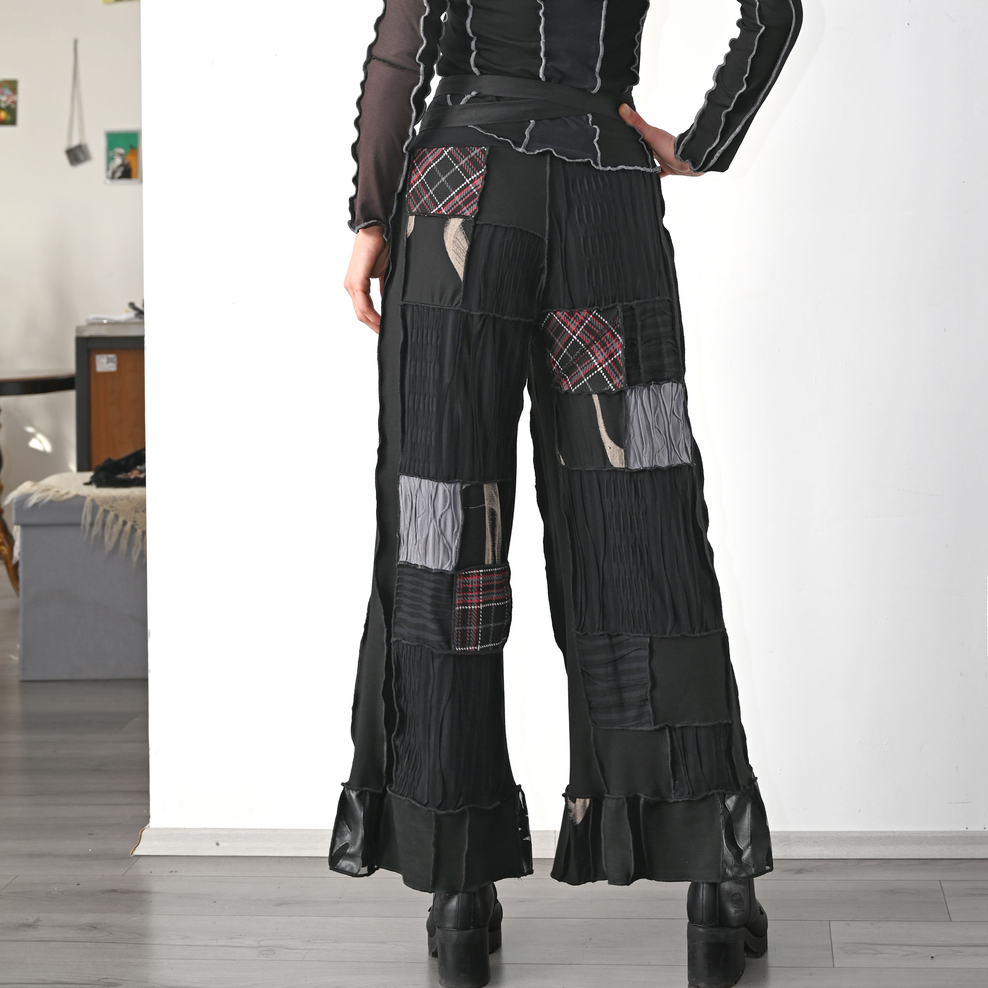 Comfortable trousers made of fuller elastic materials of various types, mostly viscose. Recycled. Length approx. 106 cm. With double belt for tying.