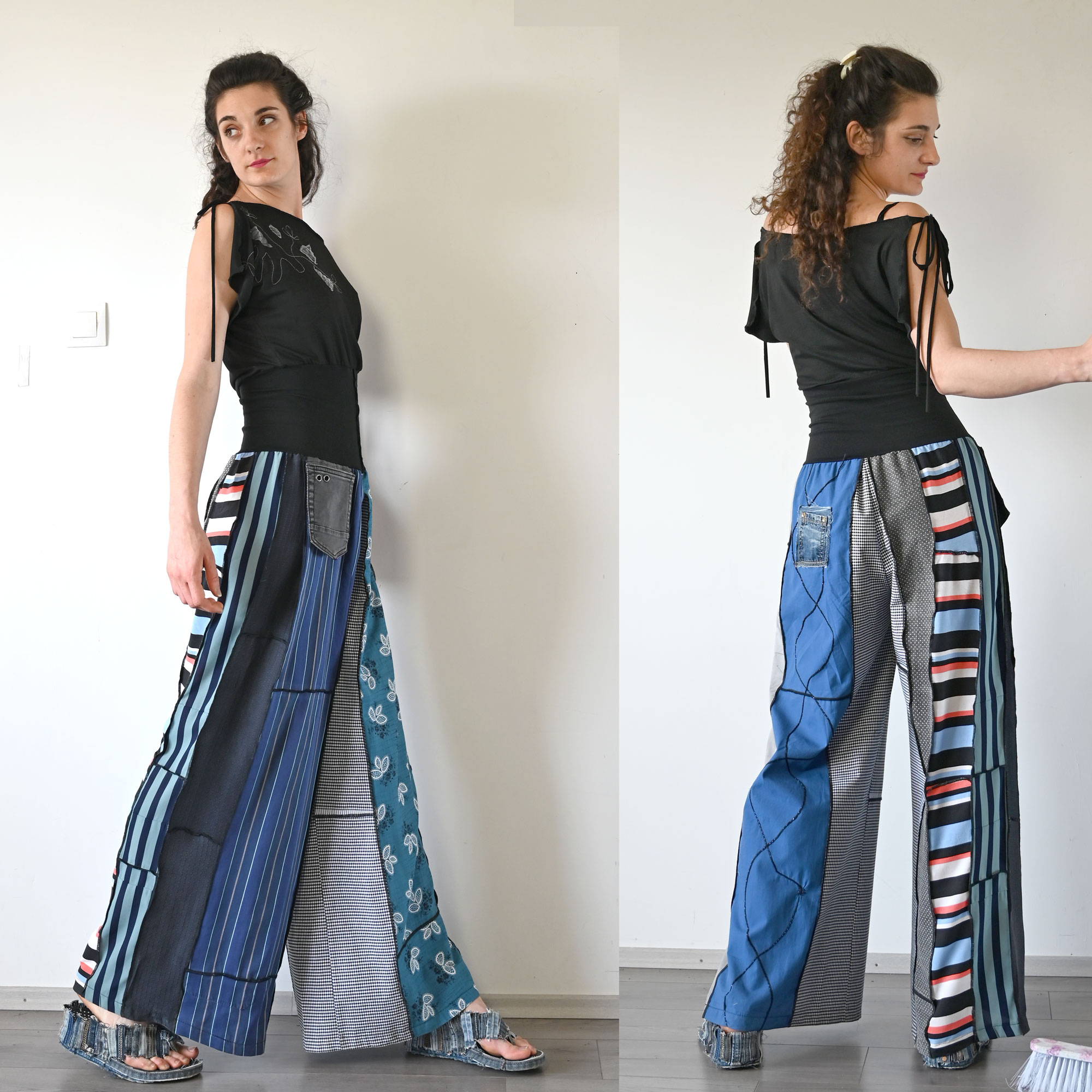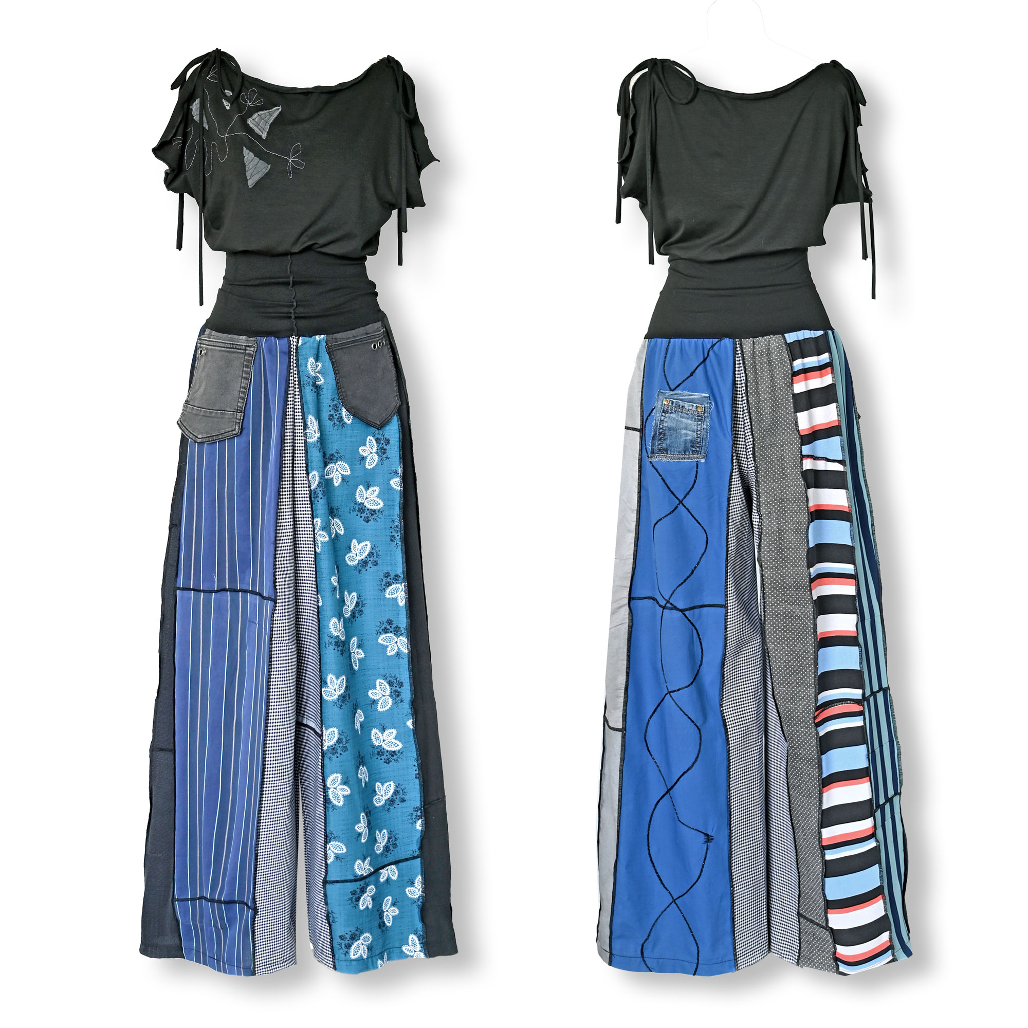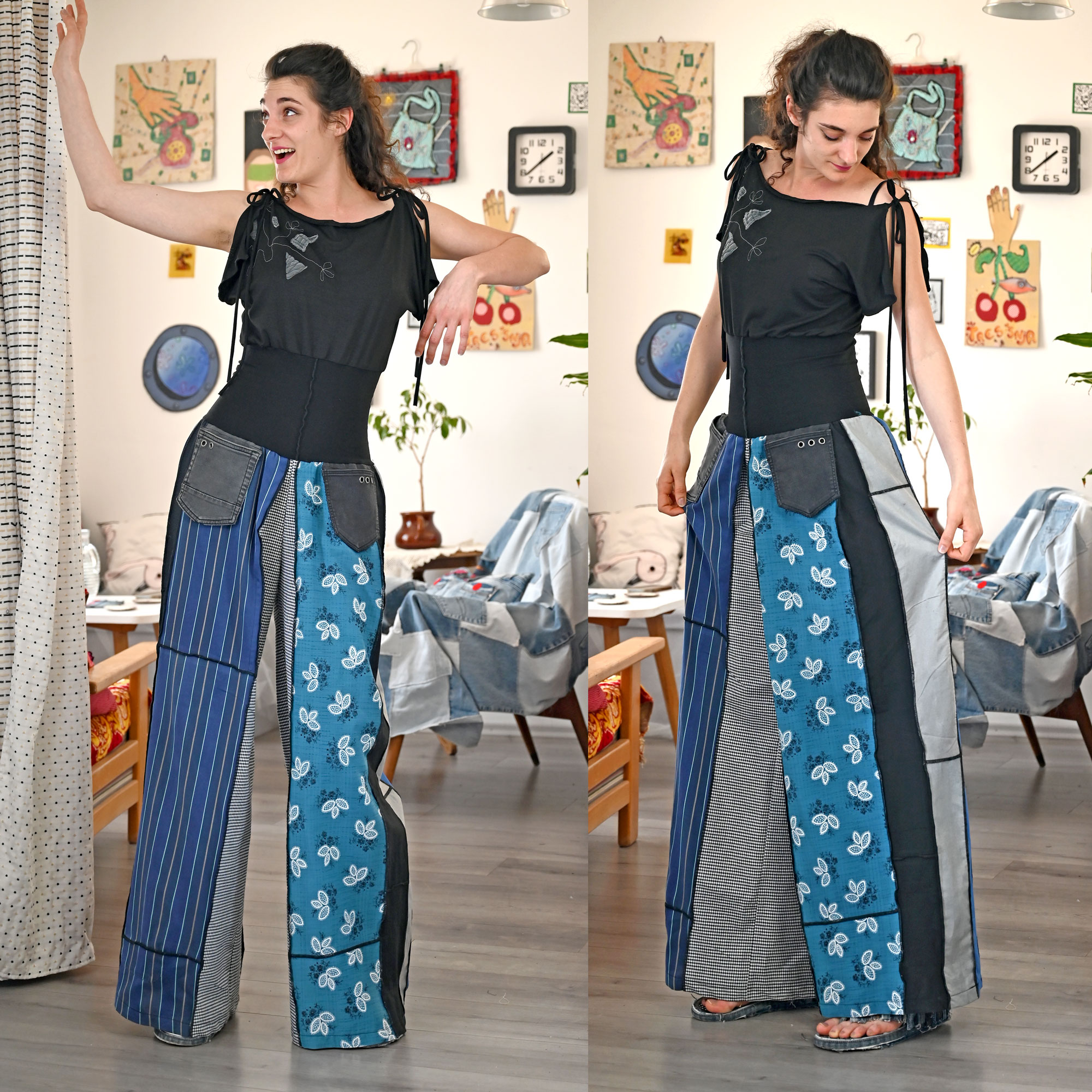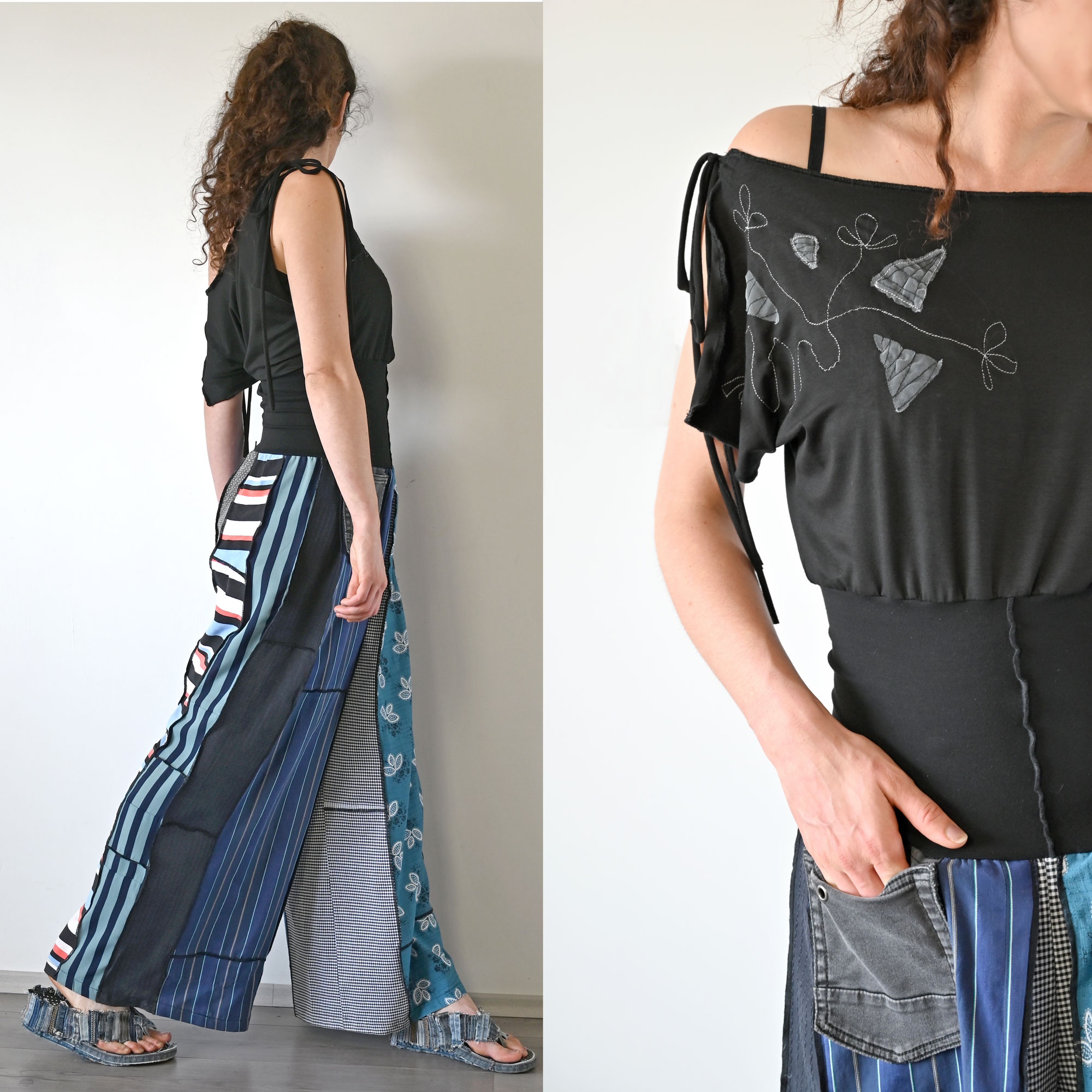 A playful jumpsuit made from recycled cotton shirts and various fabrics of natural origin. The wide elasticated waist will stay in place because of its great elasticity. The pants are elastic-free, quite wide, with a few playful pleats at the waist. The top is made of viscose jersey with elastic. The straps can or don't have to be untied when you go to the toilet. They also offer a few combinations for wearing.