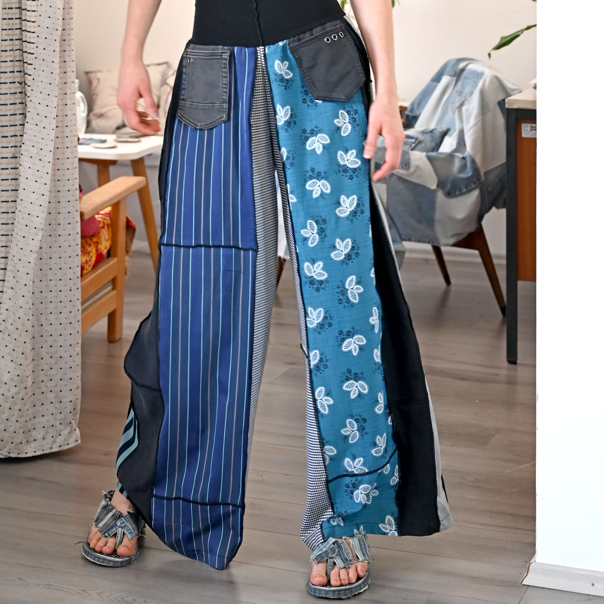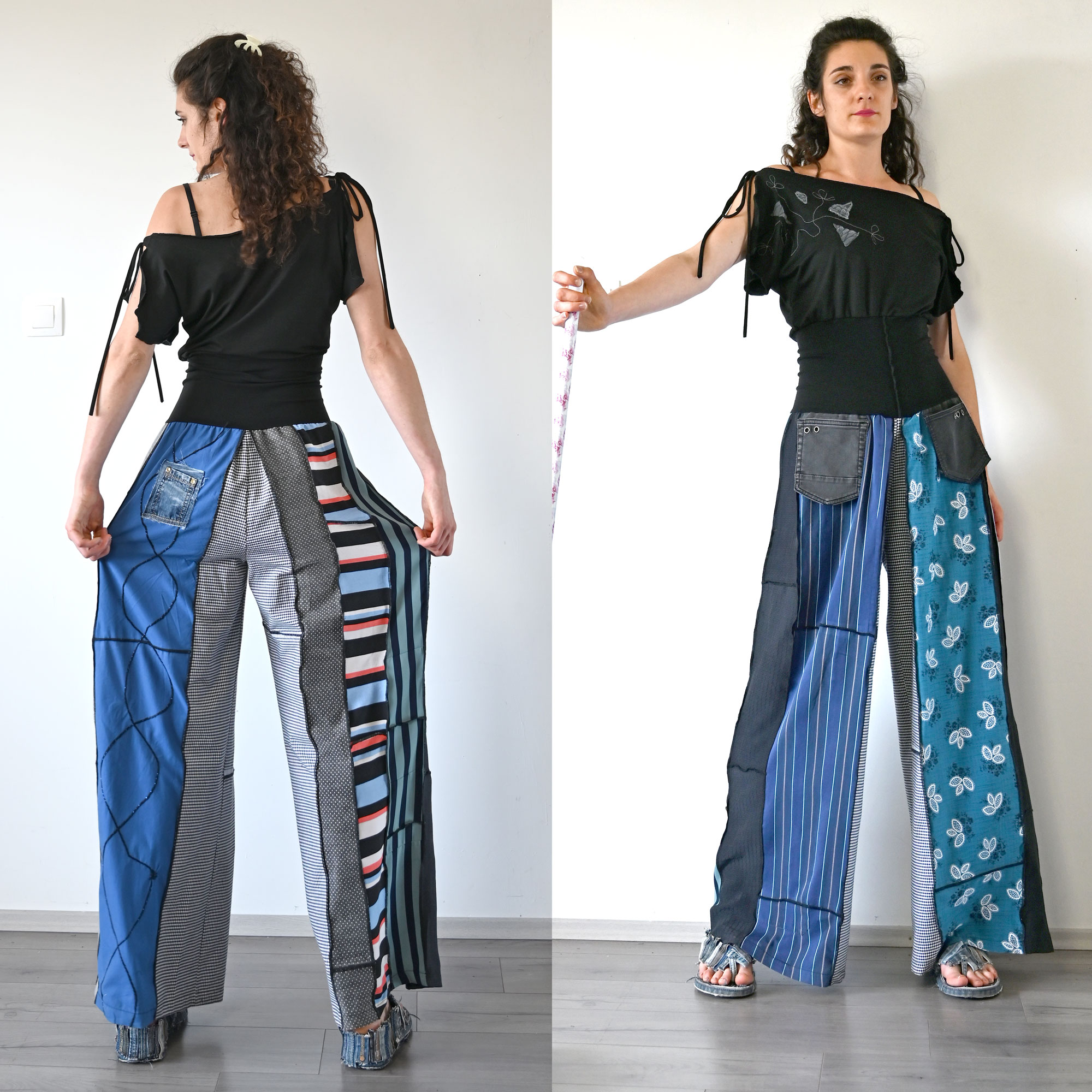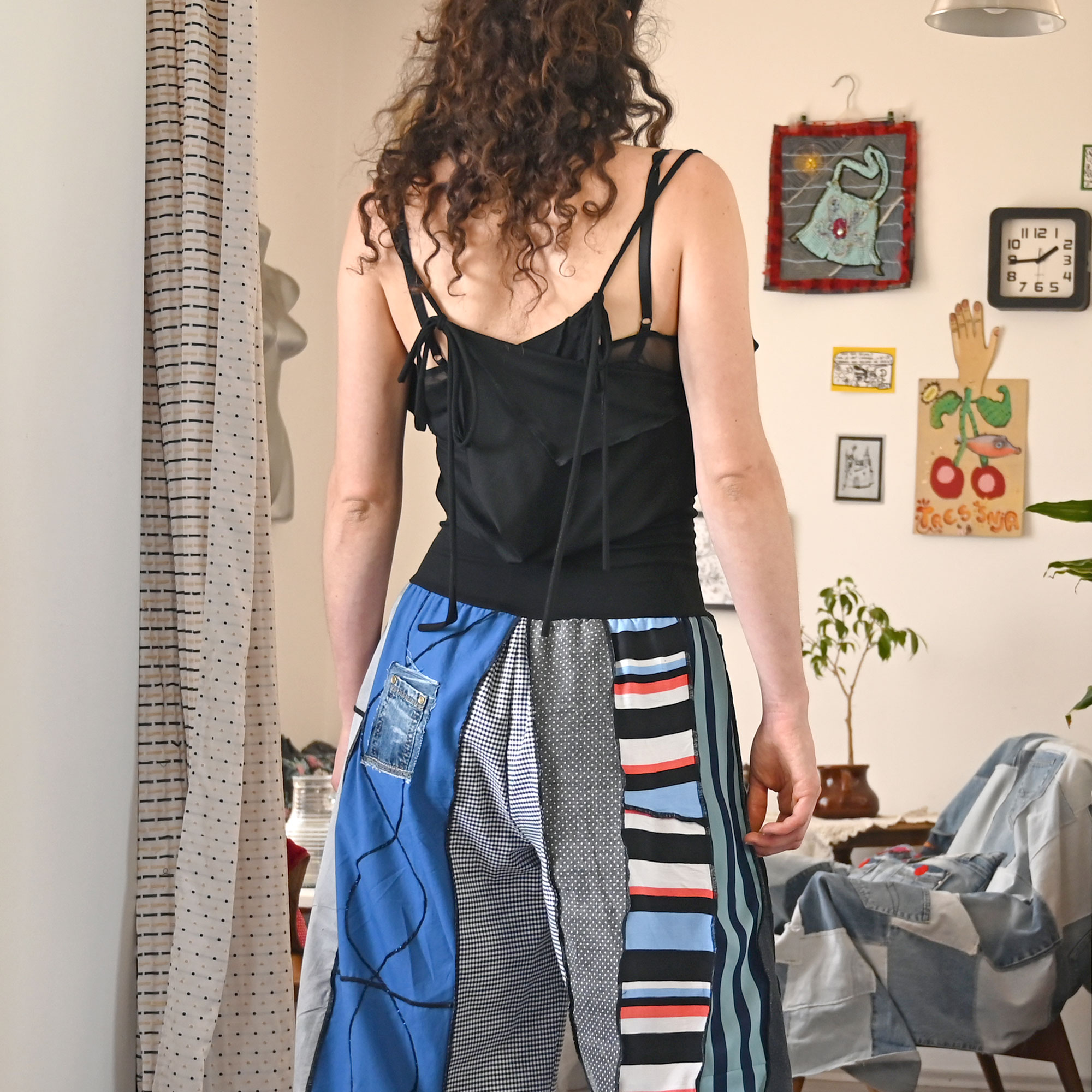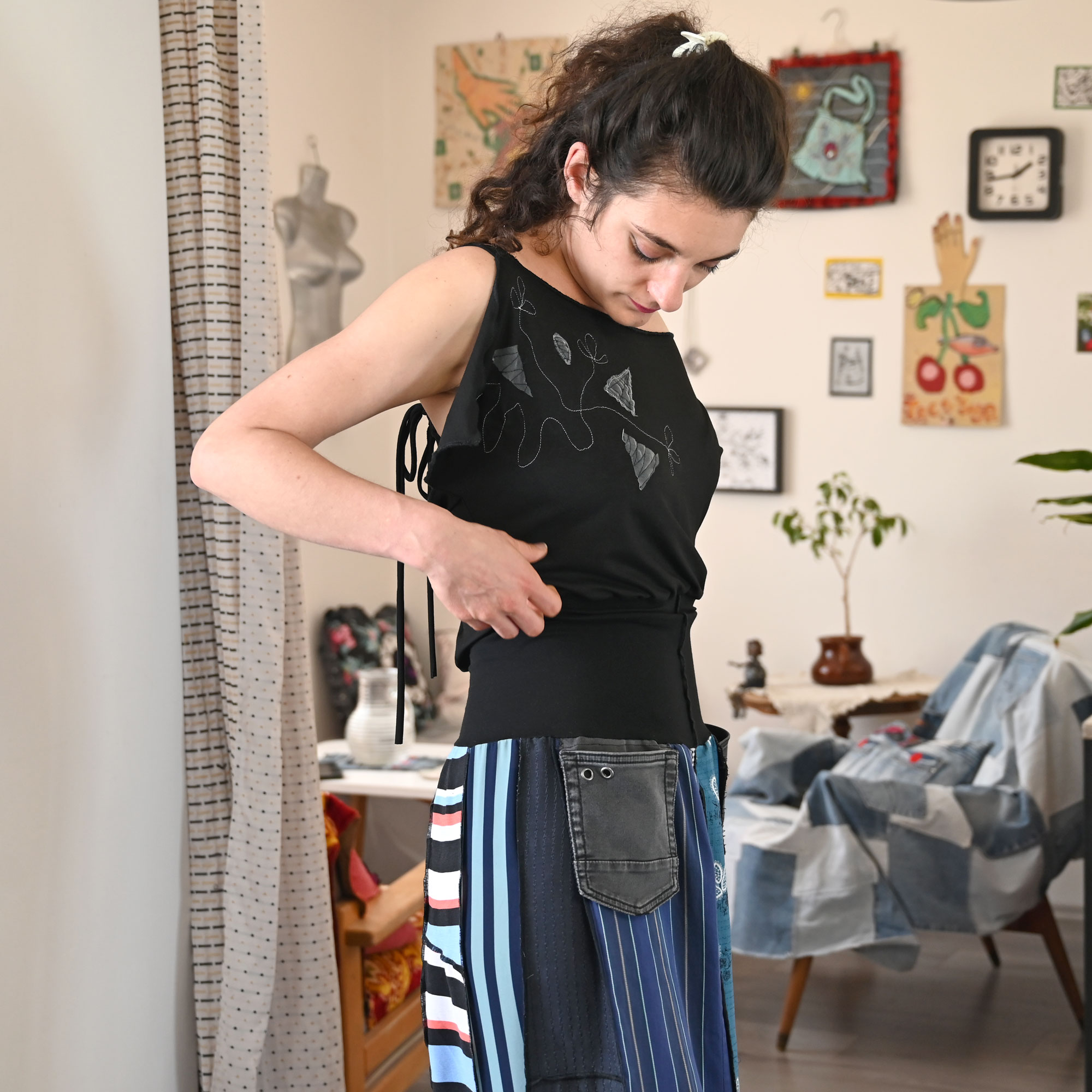A playful jumpsuit made from recycled cotton shirts and various fabrics of natural origin. The wide elasticated waist will stay in place because of its great elasticity. The pants are elastic-free, quite wide, with a few playful pleats at the waist. The top is made of viscose jersey with elastic. The straps can or don't have to be untied when you go to the toilet. They also offer a few combinations for wearing.