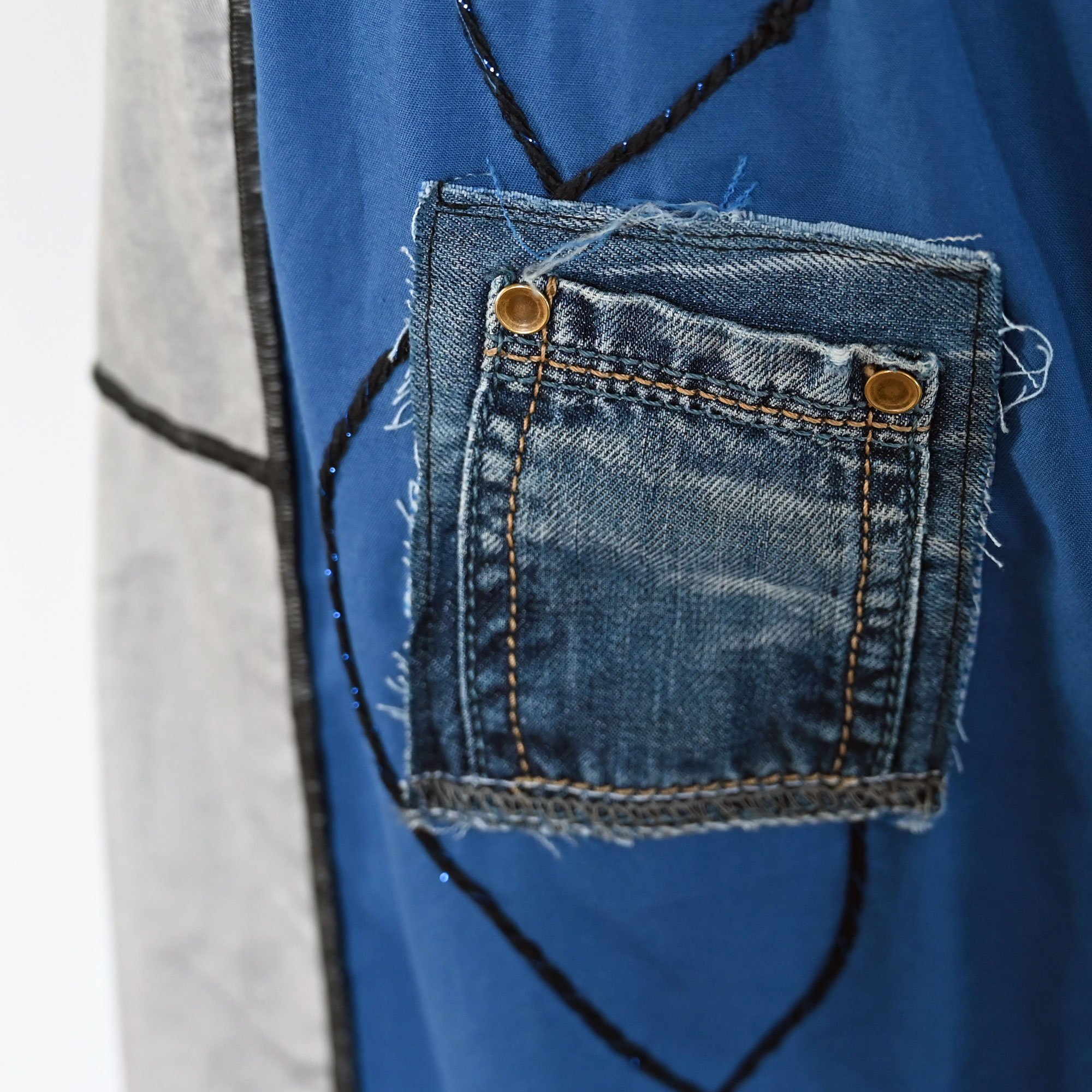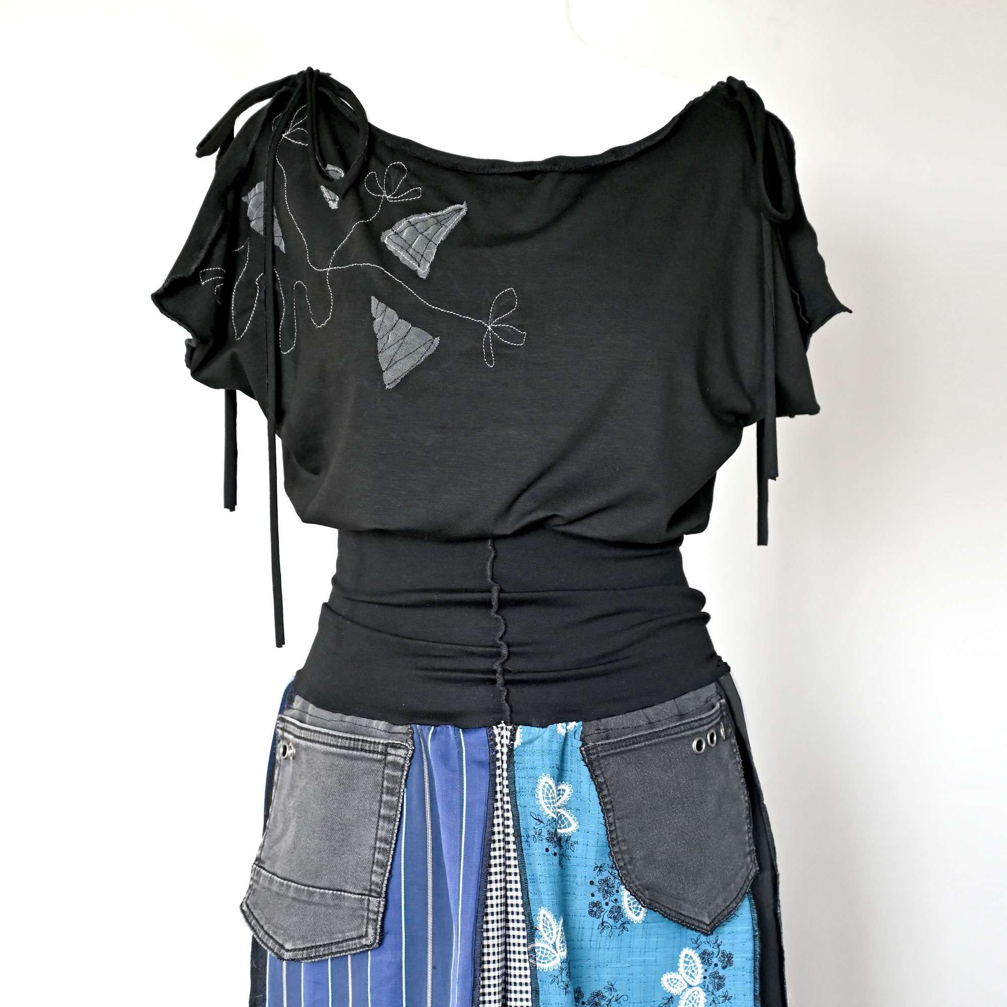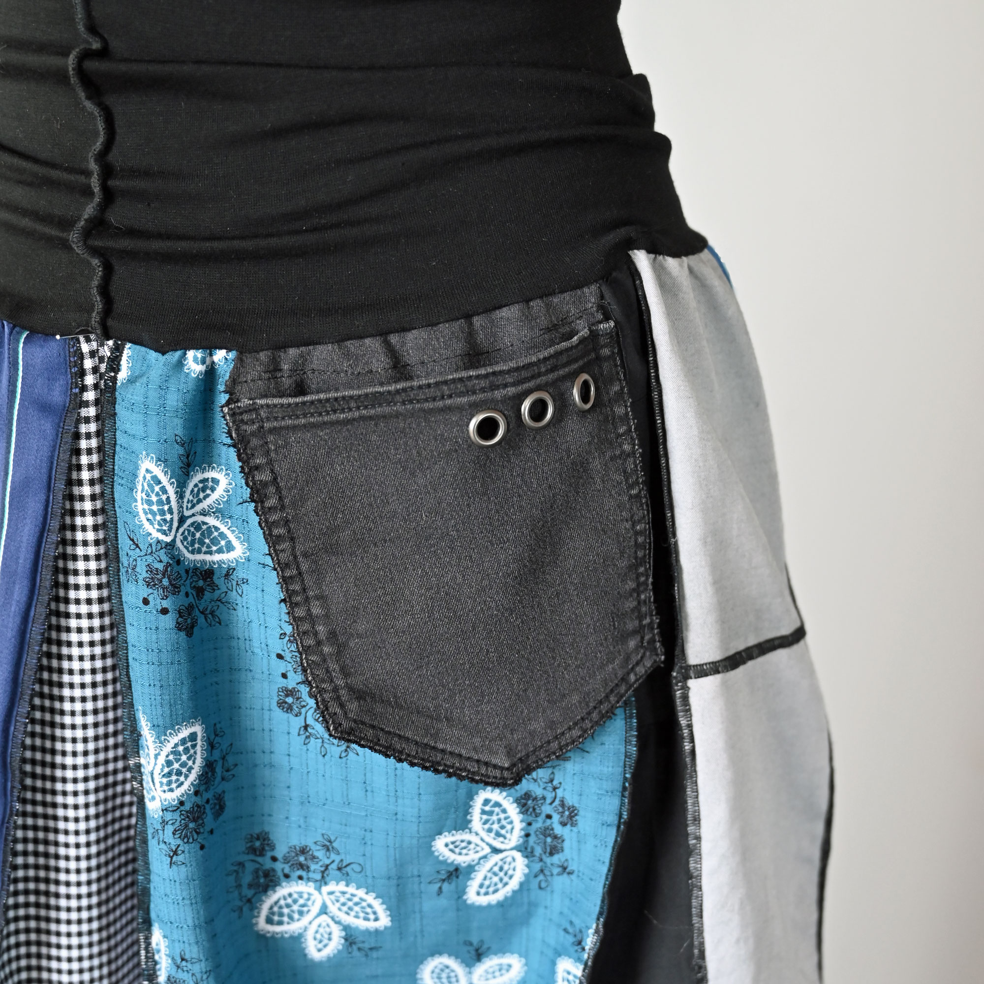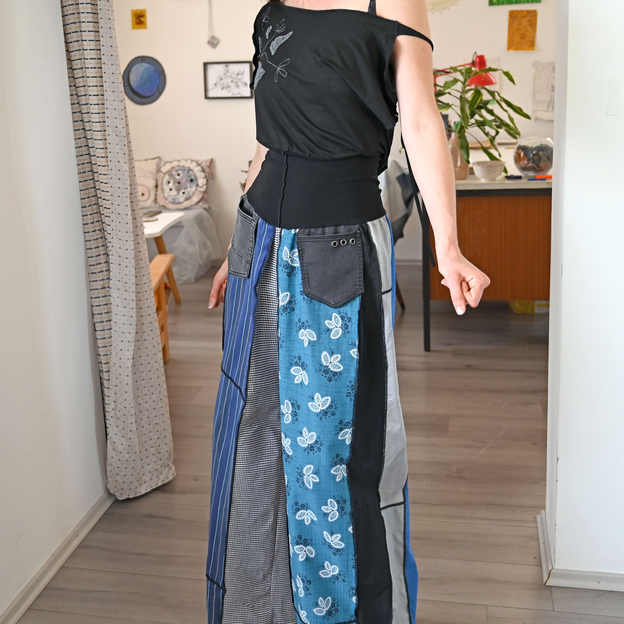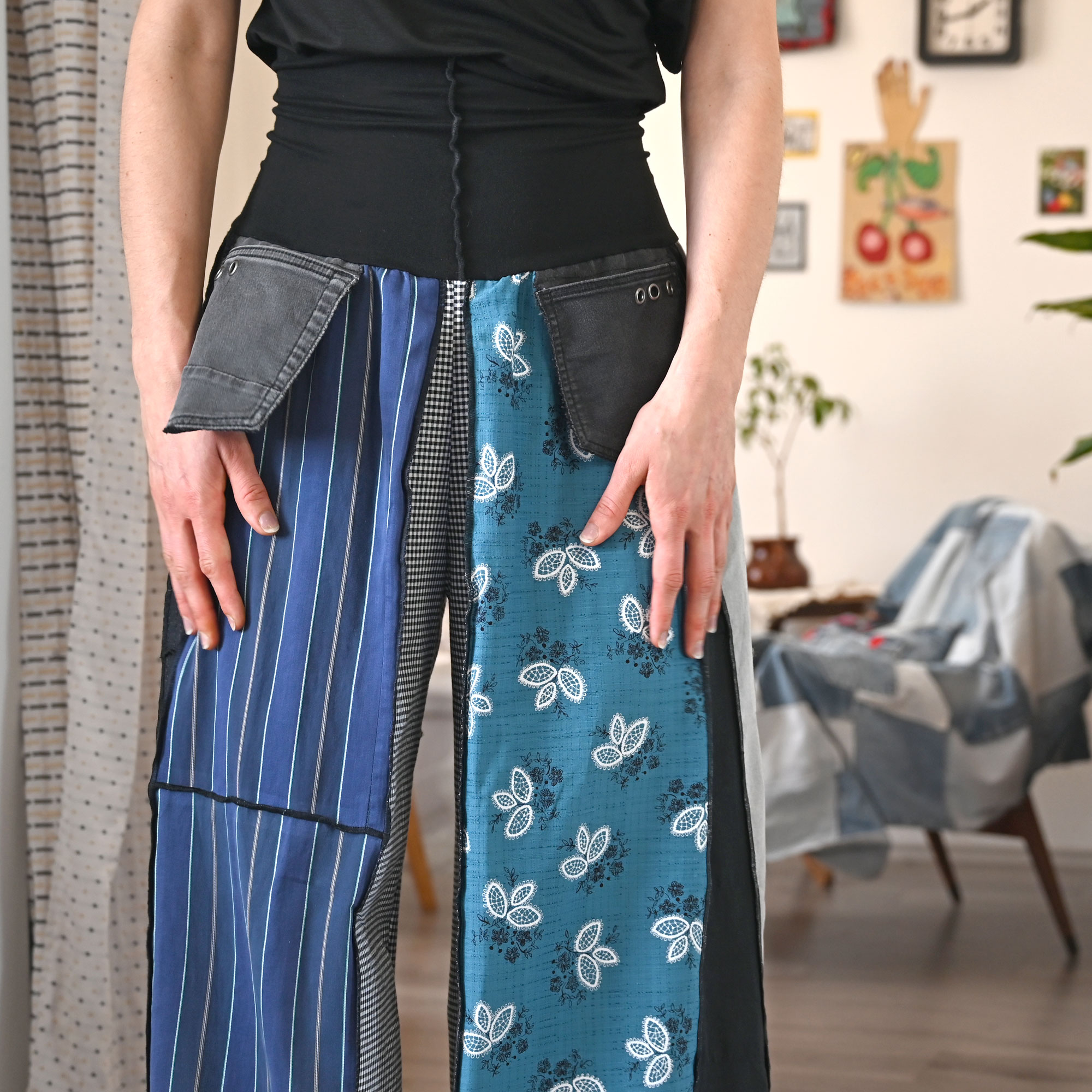 A playful jumpsuit made from recycled cotton shirts and various fabrics of natural origin. The wide elasticated waist will stay in place because of its great elasticity. The pants are elastic-free, quite wide, with a few playful pleats at the waist. The top is made of viscose jersey with elastic. The straps can or don't have to be untied when you go to the toilet. They also offer a few combinations for wearing.