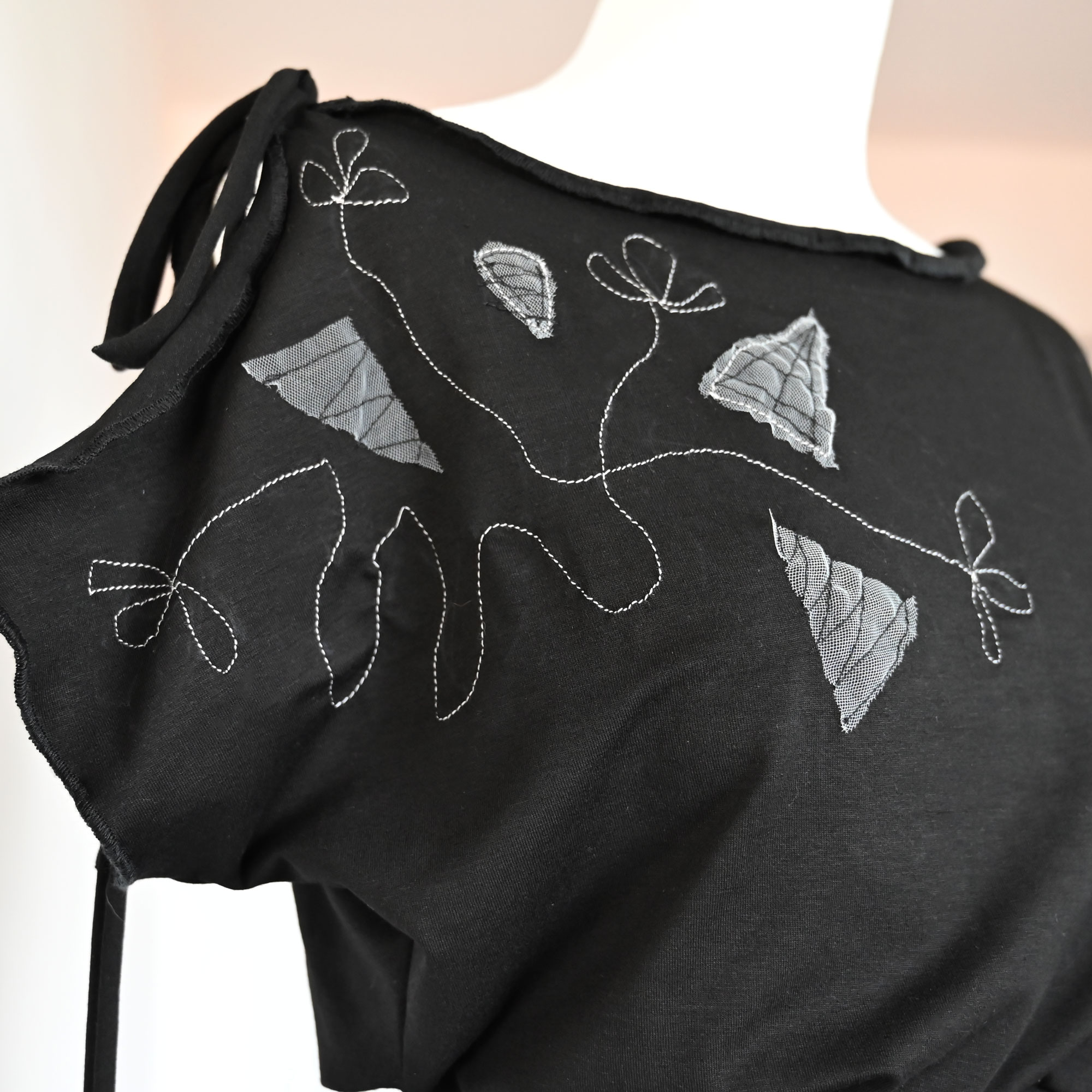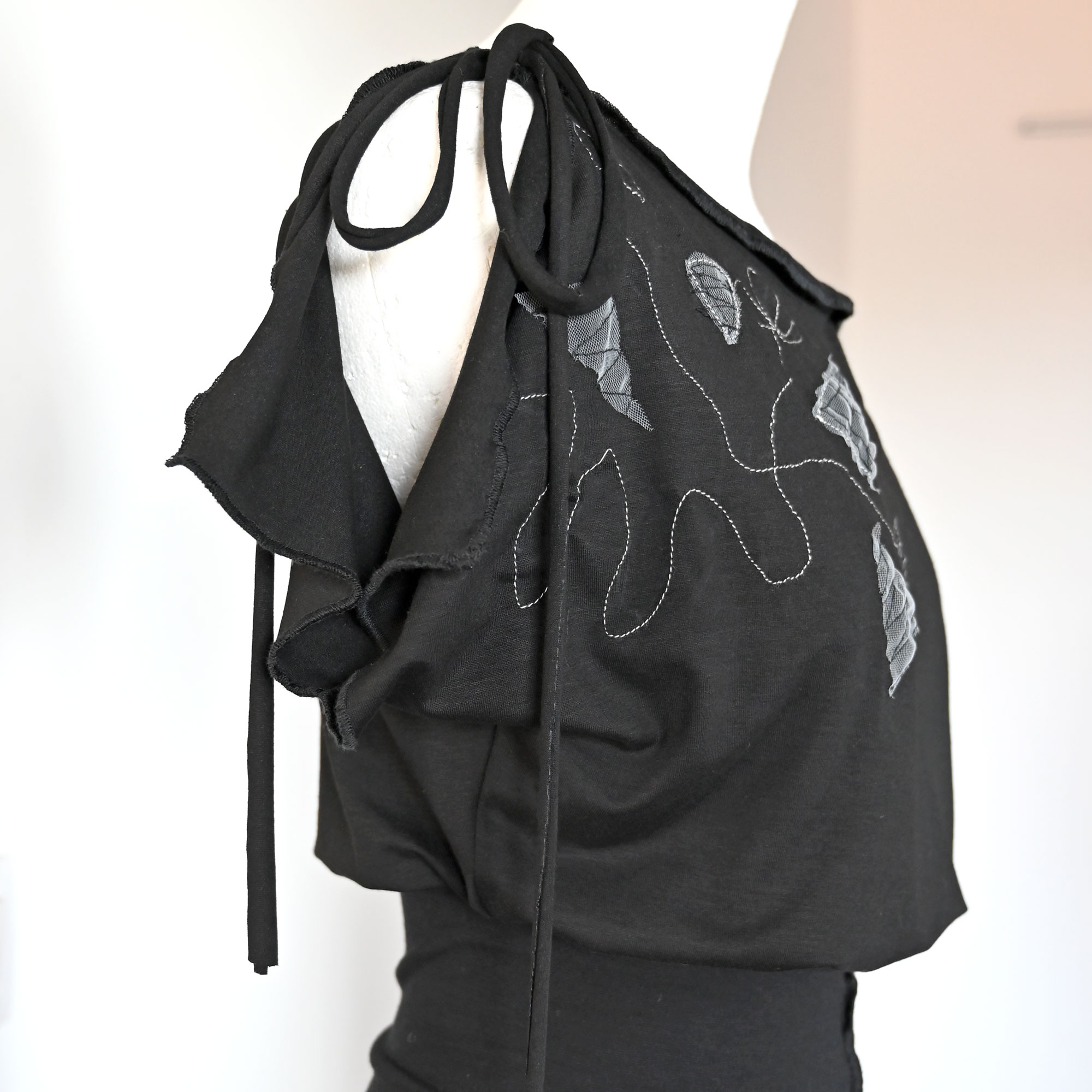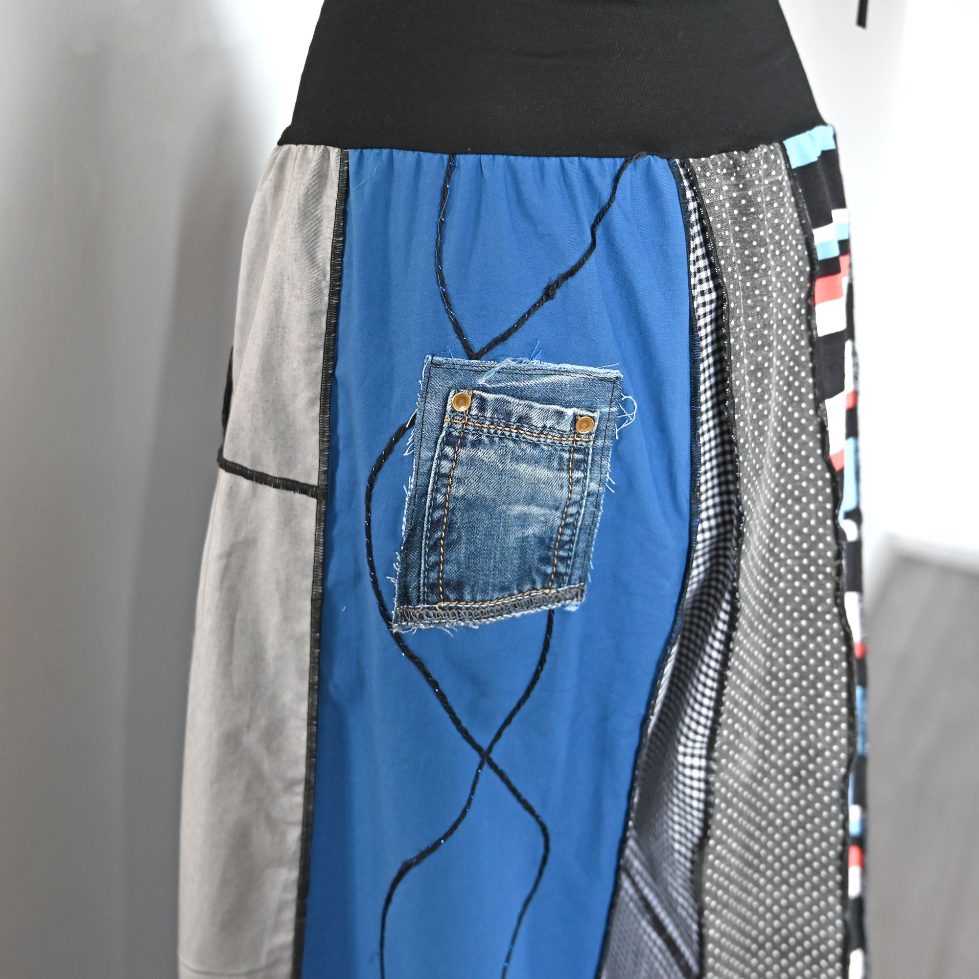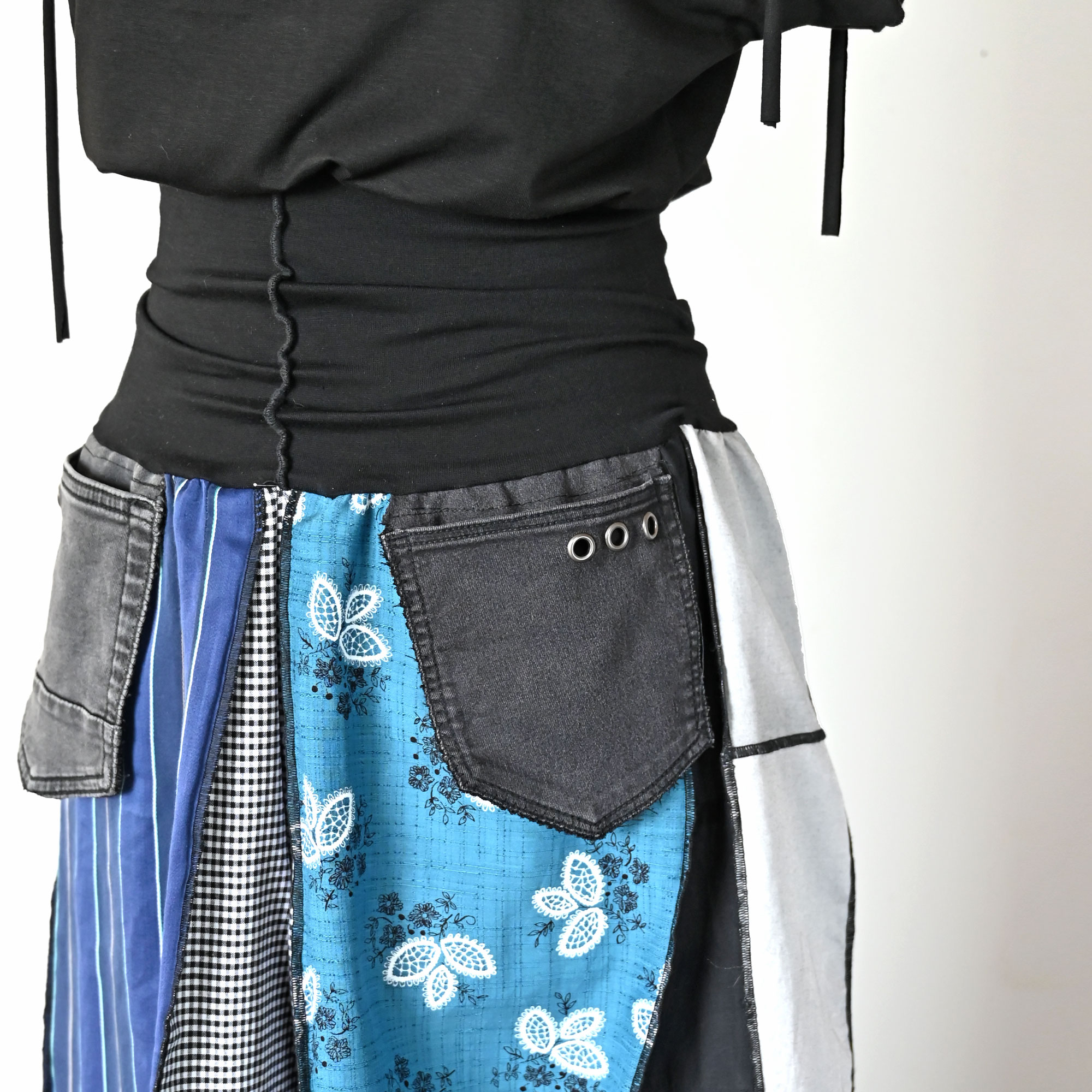 A playful jumpsuit made from recycled cotton shirts and various fabrics of natural origin. The wide elasticated waist will stay in place because of its great elasticity. The pants are elastic-free, quite wide, with a few playful pleats at the waist. The top is made of viscose jersey with elastic. The straps can or don't have to be untied when you go to the toilet. They also offer a few combinations for wearing.