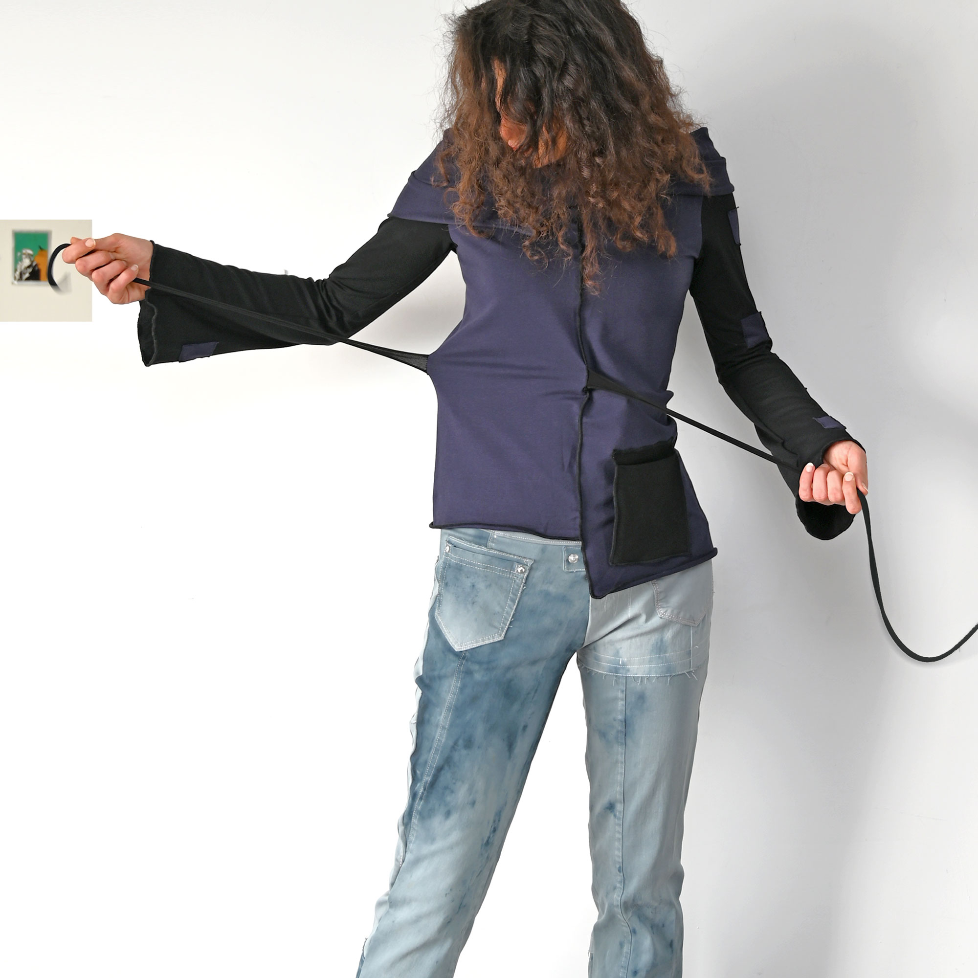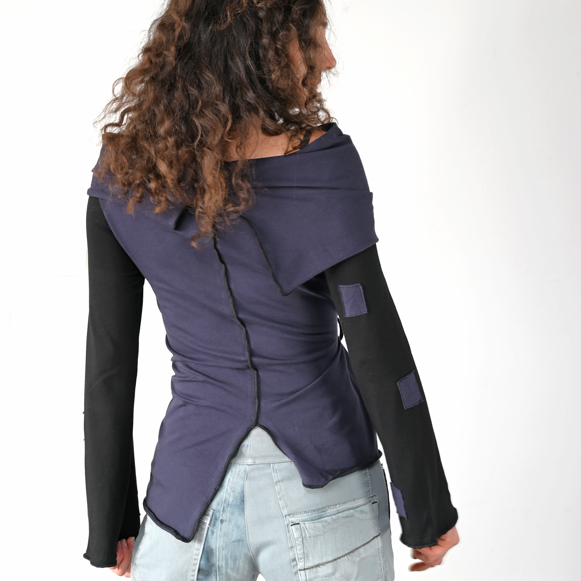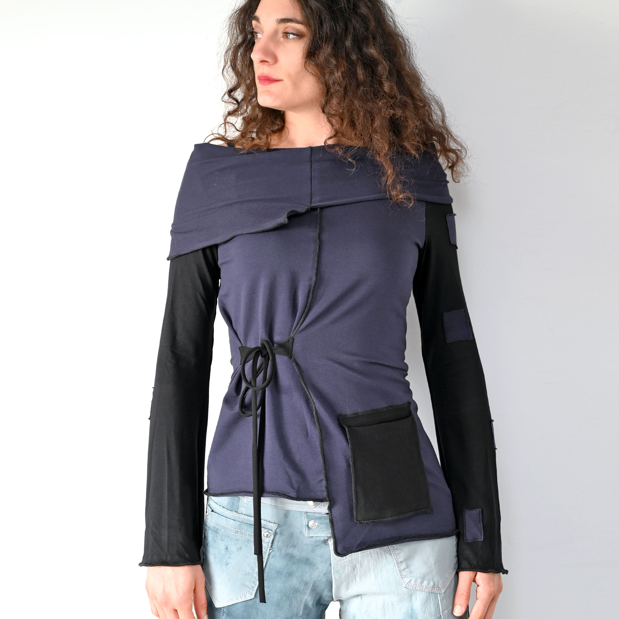 Shirt made of elastic cotton fleece, with sleeves and inserts made of fuller viscose jersey with elastane. Asymmetrical. Sleeves flare downwards.
