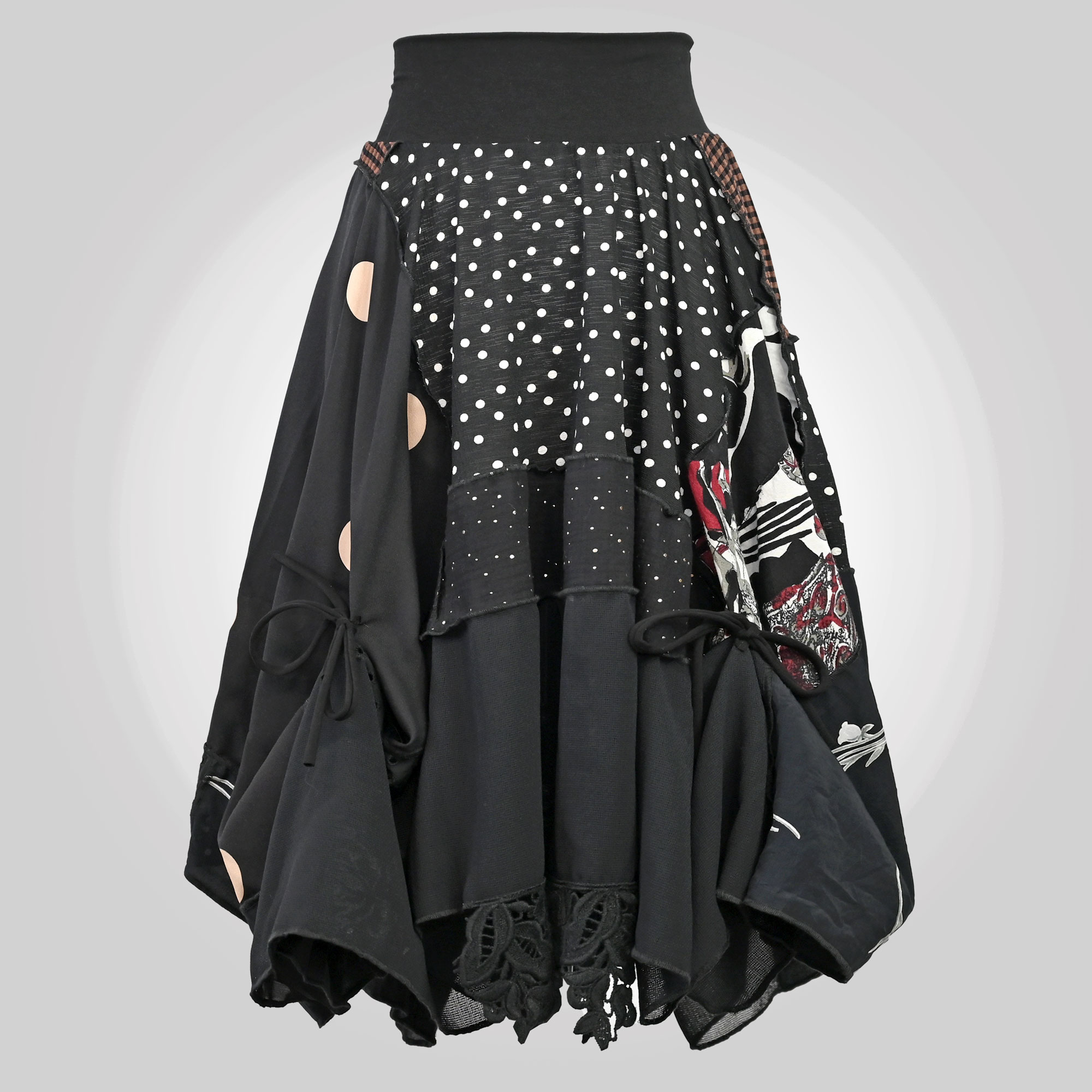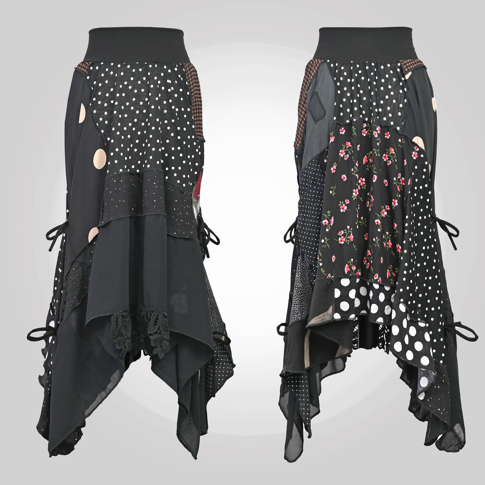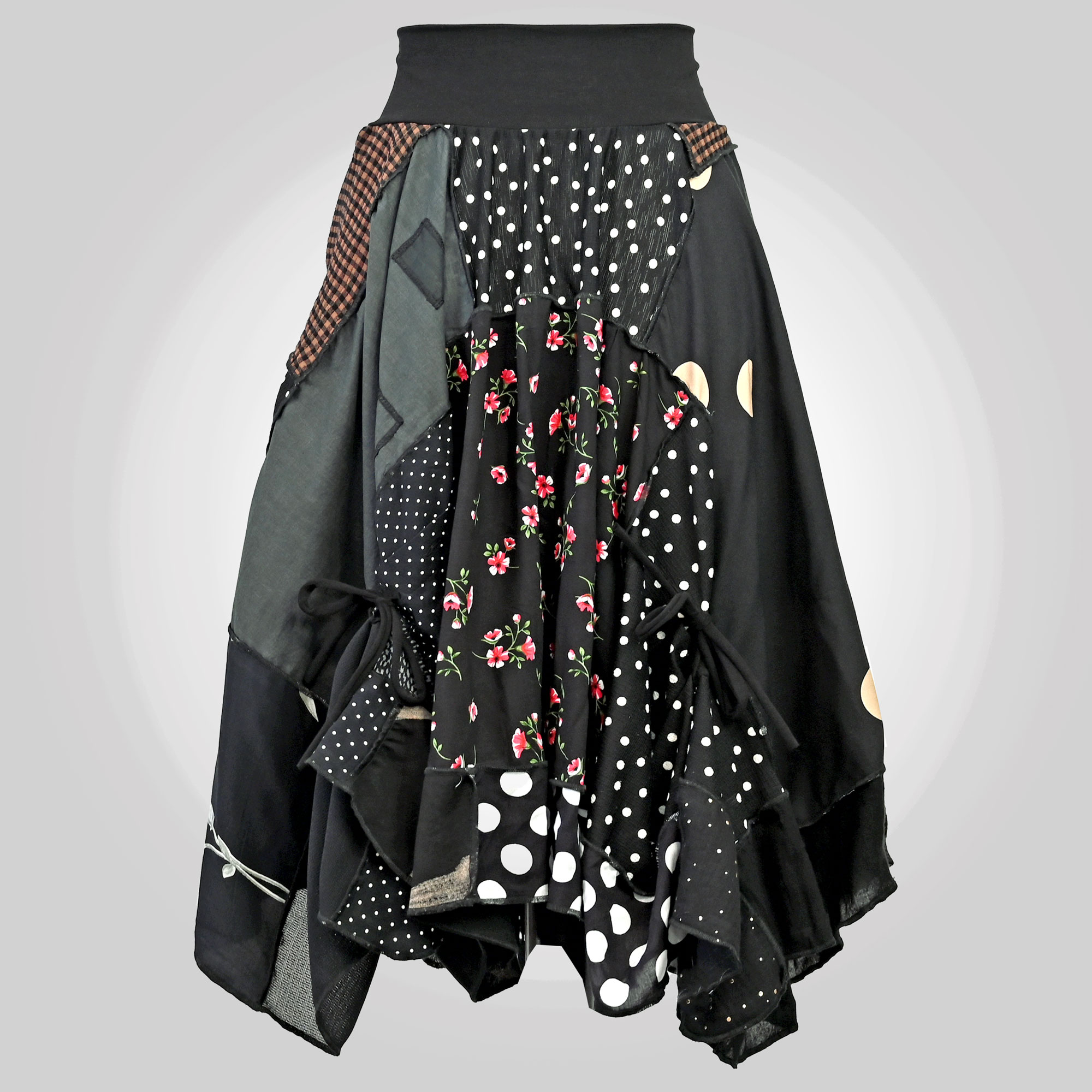 A full circle skirt (square), made of various cotton, silk, viscose and synthetic fabrics. With laces that can be tied in at least three ways. Wearable all year round. If you lift it above the chest, it becomes a tunic.