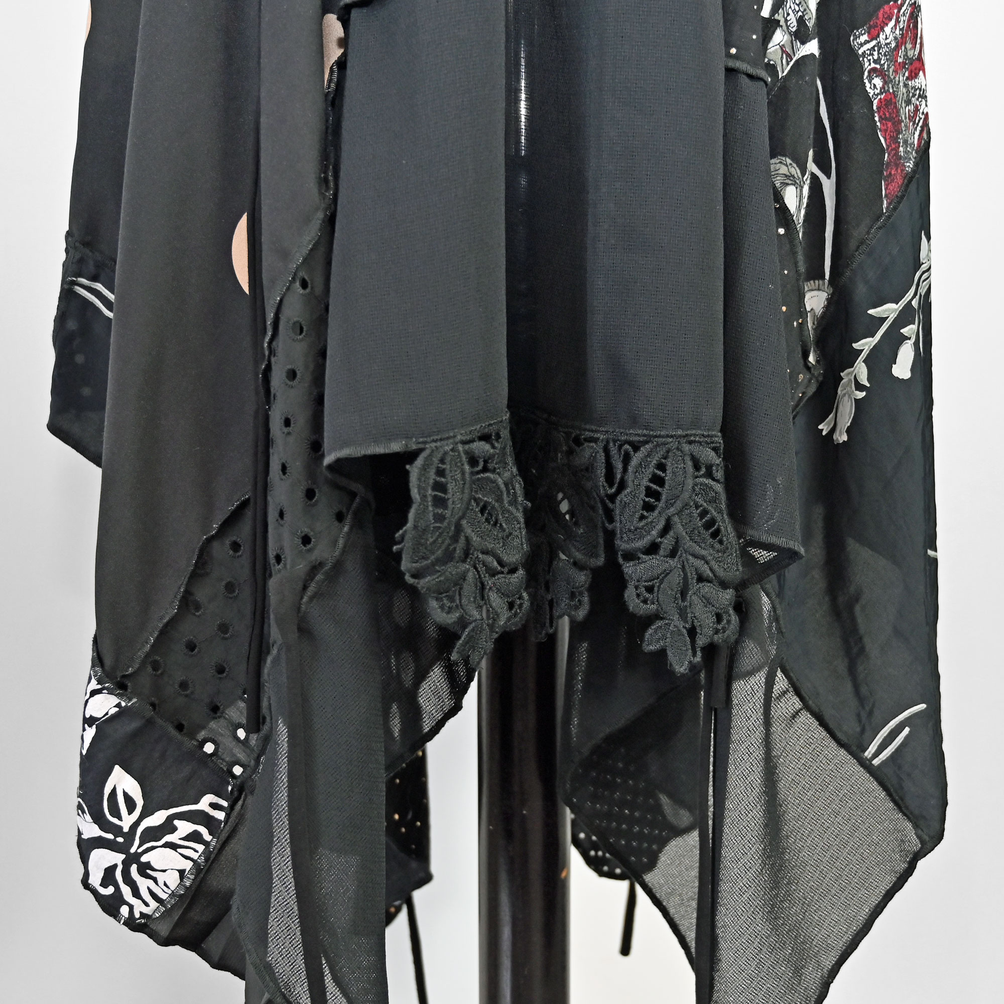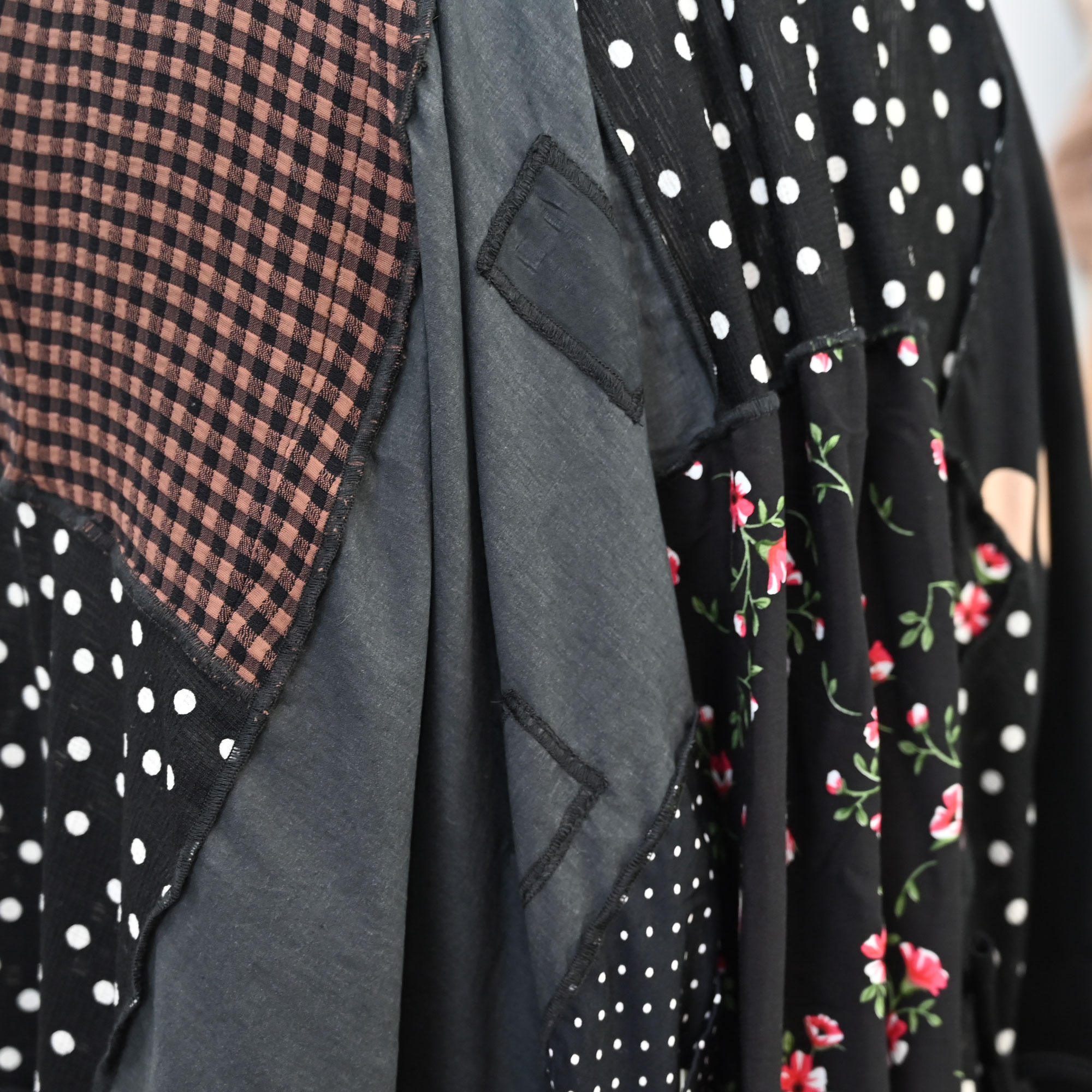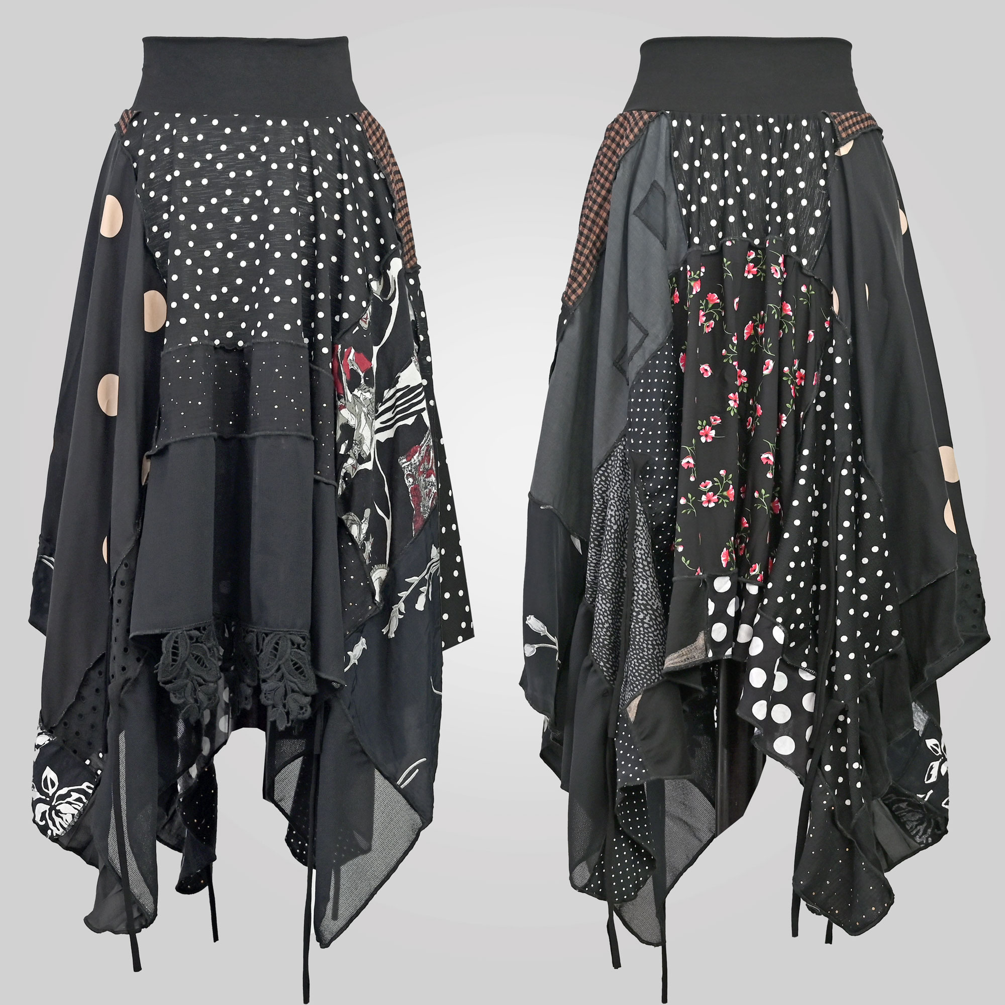 A full circle skirt (square), made of various cotton, silk, viscose and synthetic fabrics. With laces that can be tied in at least three ways. Wearable all year round. If you lift it above the chest, it becomes a tunic.